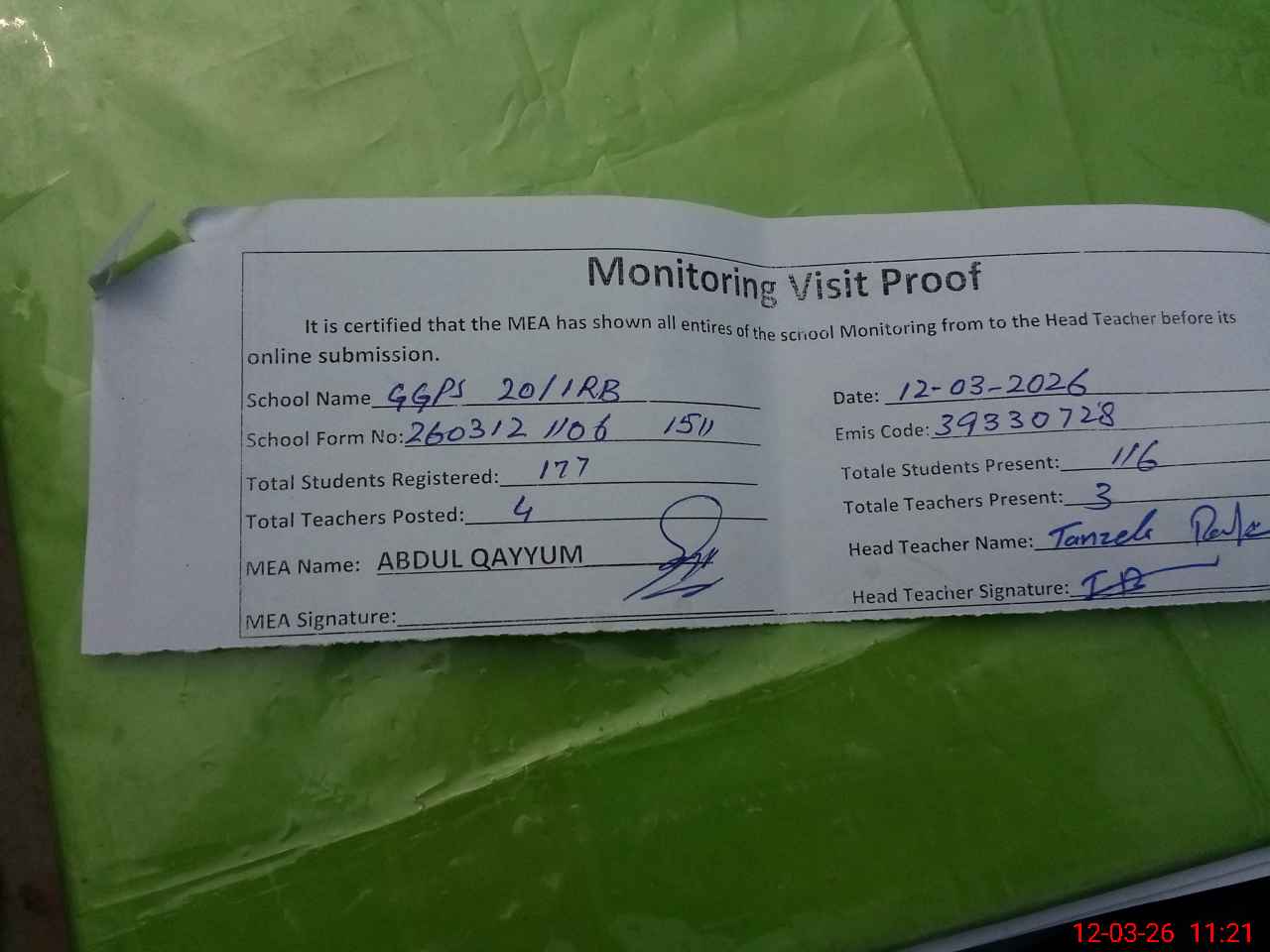 | EMIS Code: 39330728 | Name of School: GGPS CHAK NO. 20/1-RB | |||