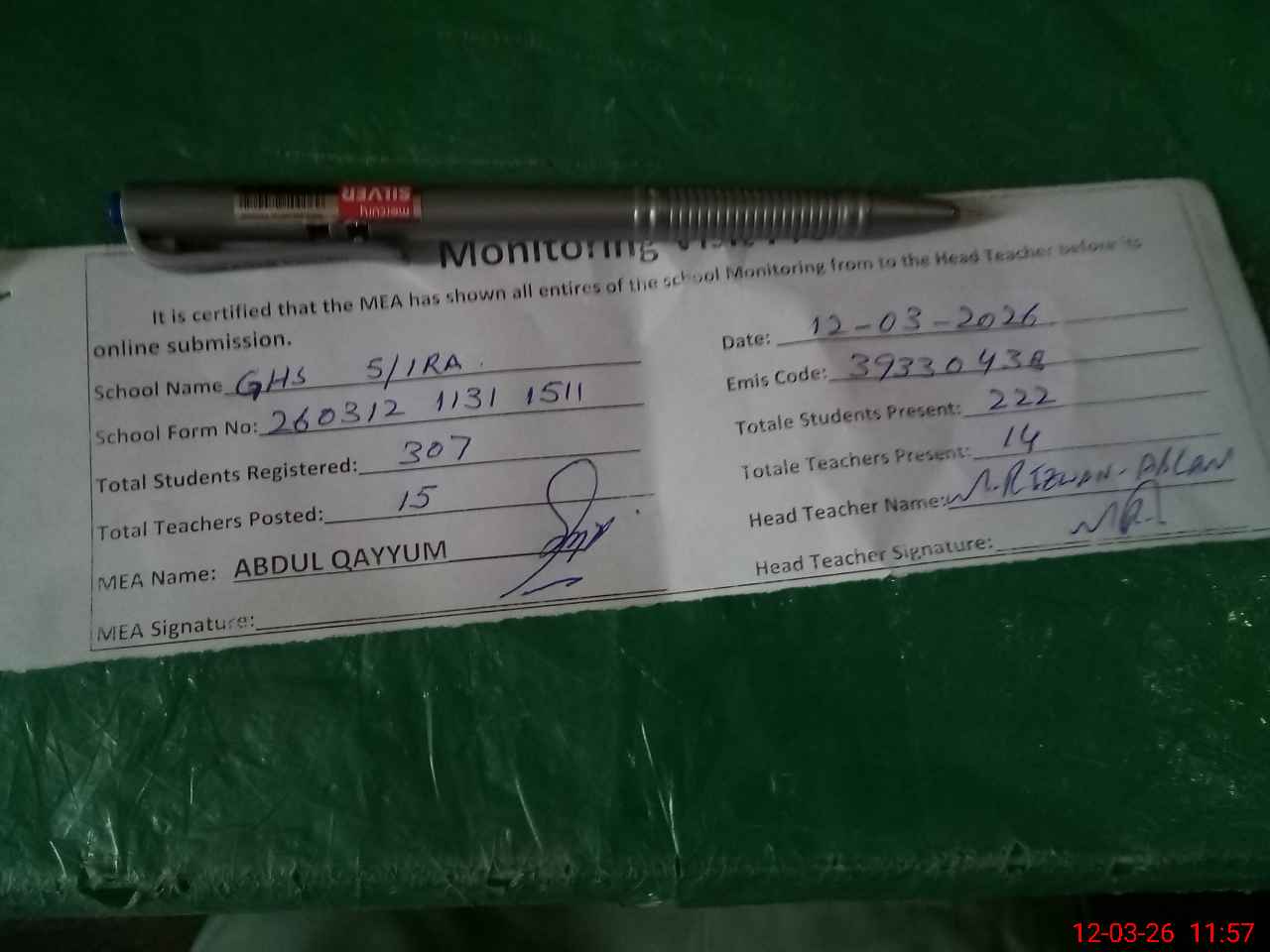 | EMIS Code: 39330438 | Name of School: GHS CHAK NO. 5/1-RA | |||