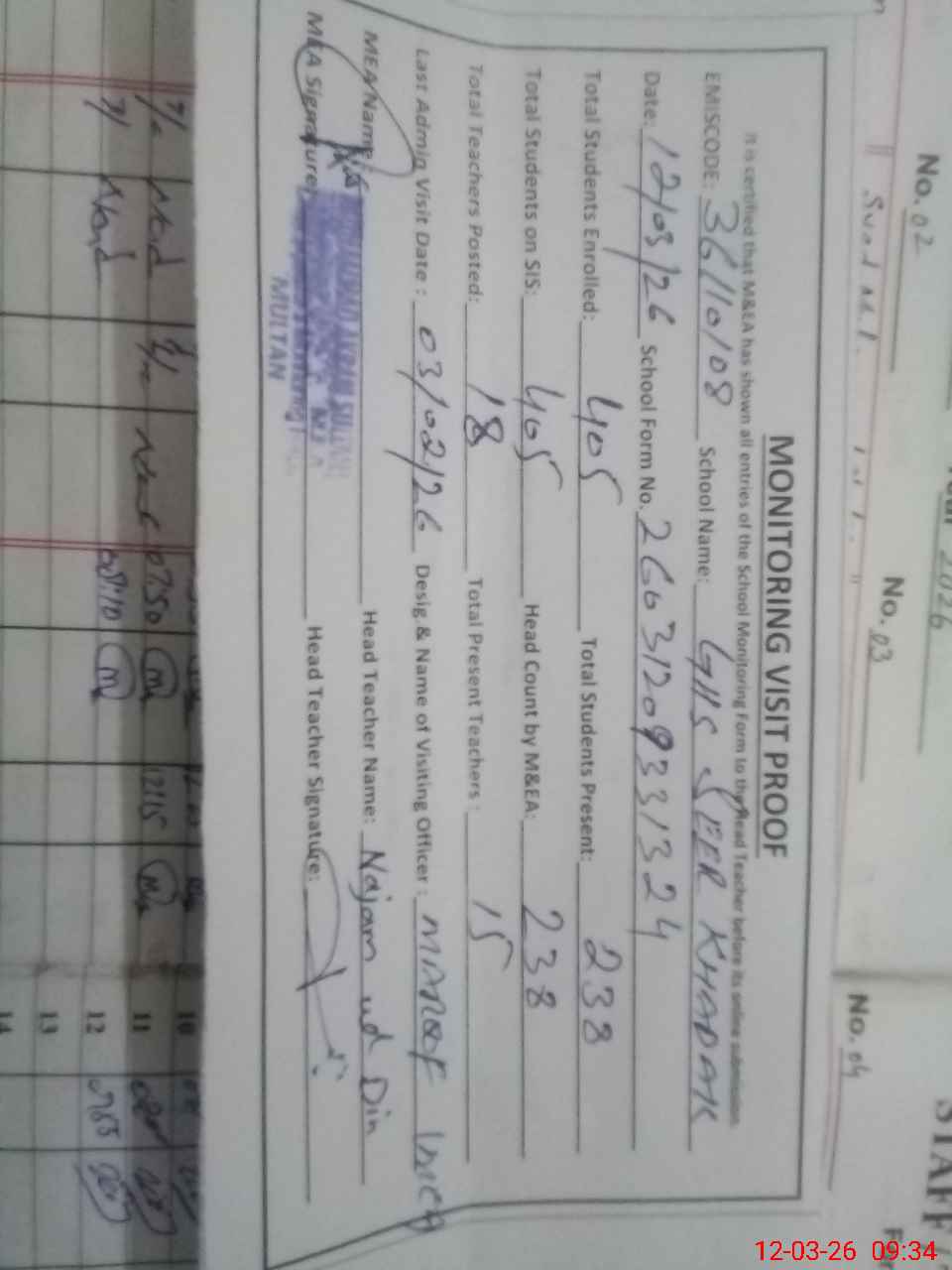 | Certified that this School was Inspected by the Undersigned MEA/DMO Today and the Information Stated Above is as Per Record. | |||||