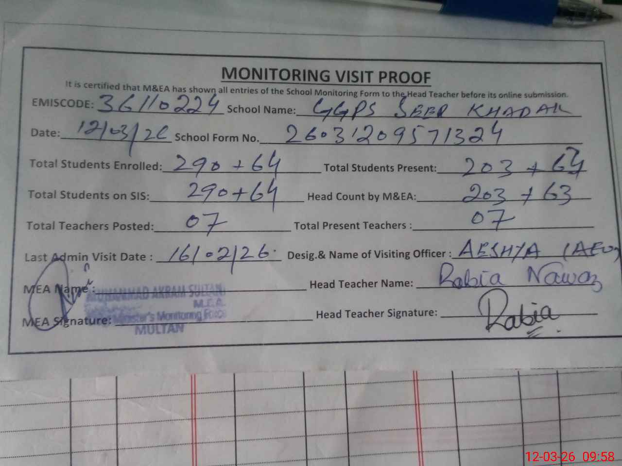 | Attendance Register | Head Teacher | MEA with School | Visit Proof |