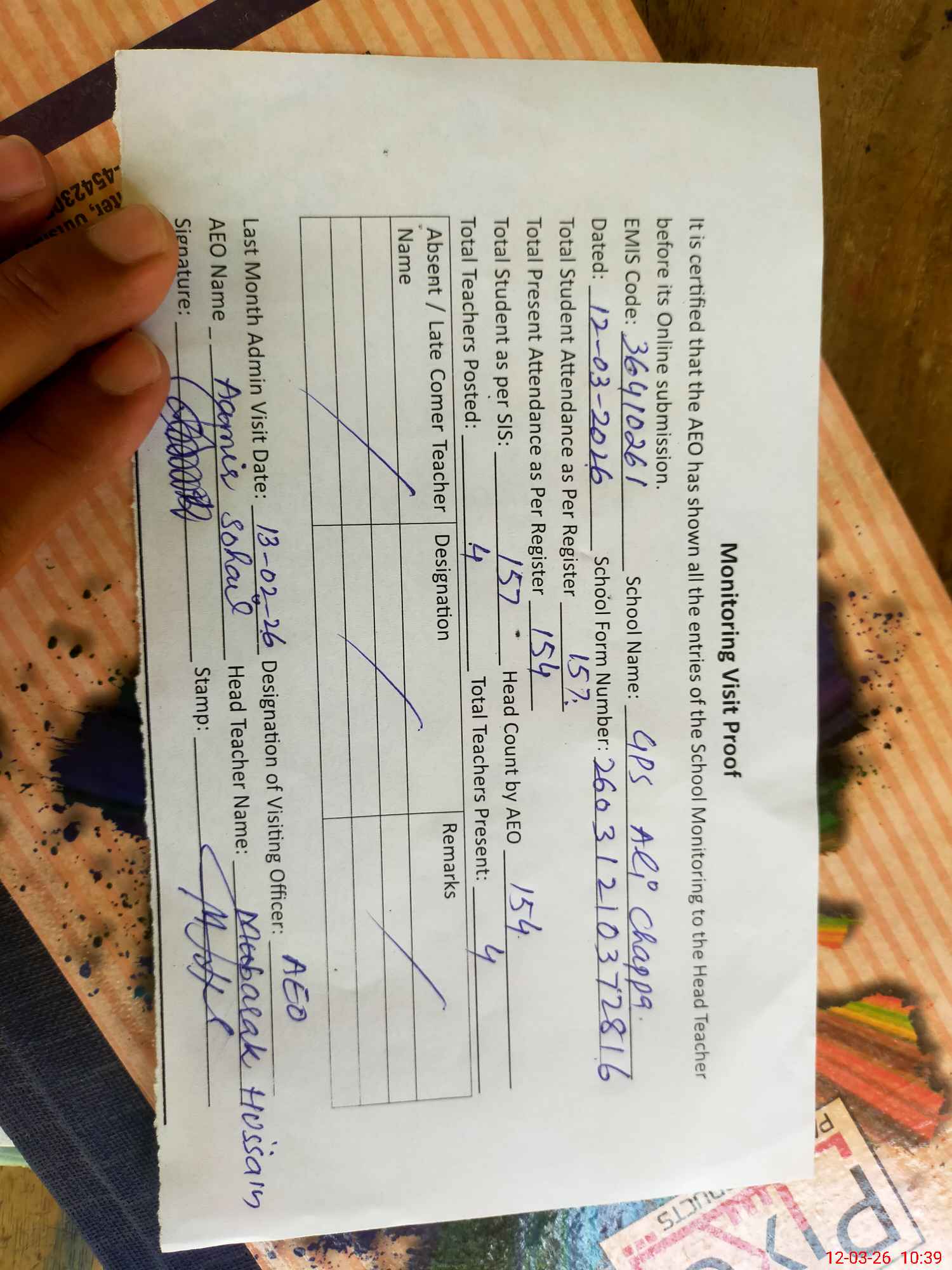 | EMIS Code: 36410261 | Name of School: GPS ALI CHAPPA, P/O 9-B/8-R, ABDUL HAKIM | |||