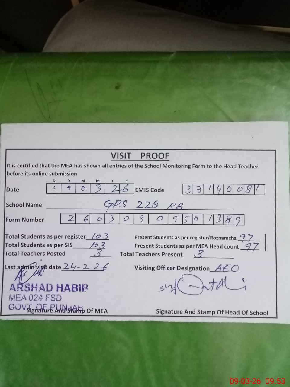 | Monitoring Date: 09-03-2026 | Start Time: 09-03-2026 09:17 AM | End Time: 09-03-2026 09:54 AM | Name of MEA: AR**** HA**** | |