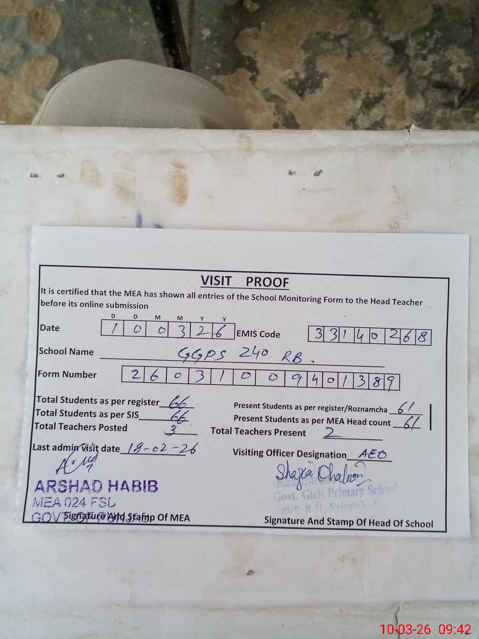 | EMIS Code: 33140268 | Name of School: GGPS 240 RB KHOJAY WALA | |||