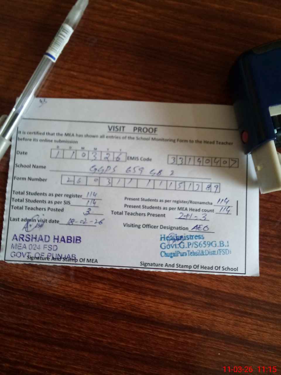 | Attendance Register | Head Teacher | MEA with School | Visit Proof |