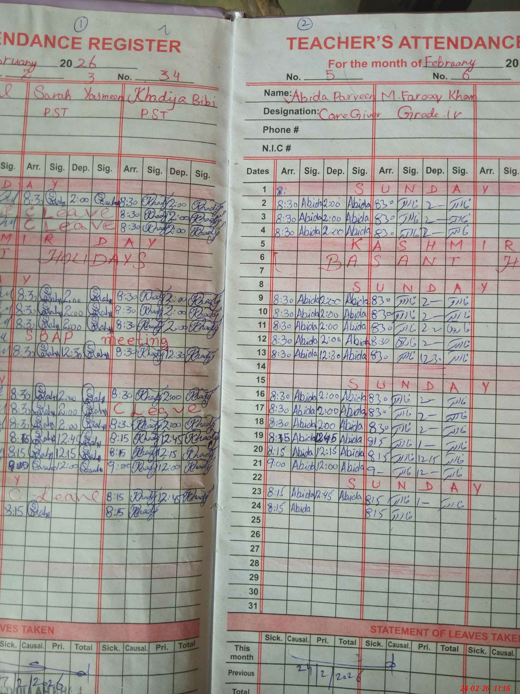 | Leave | Duty | Absent | Maternity | Medical | Ex- Pak |