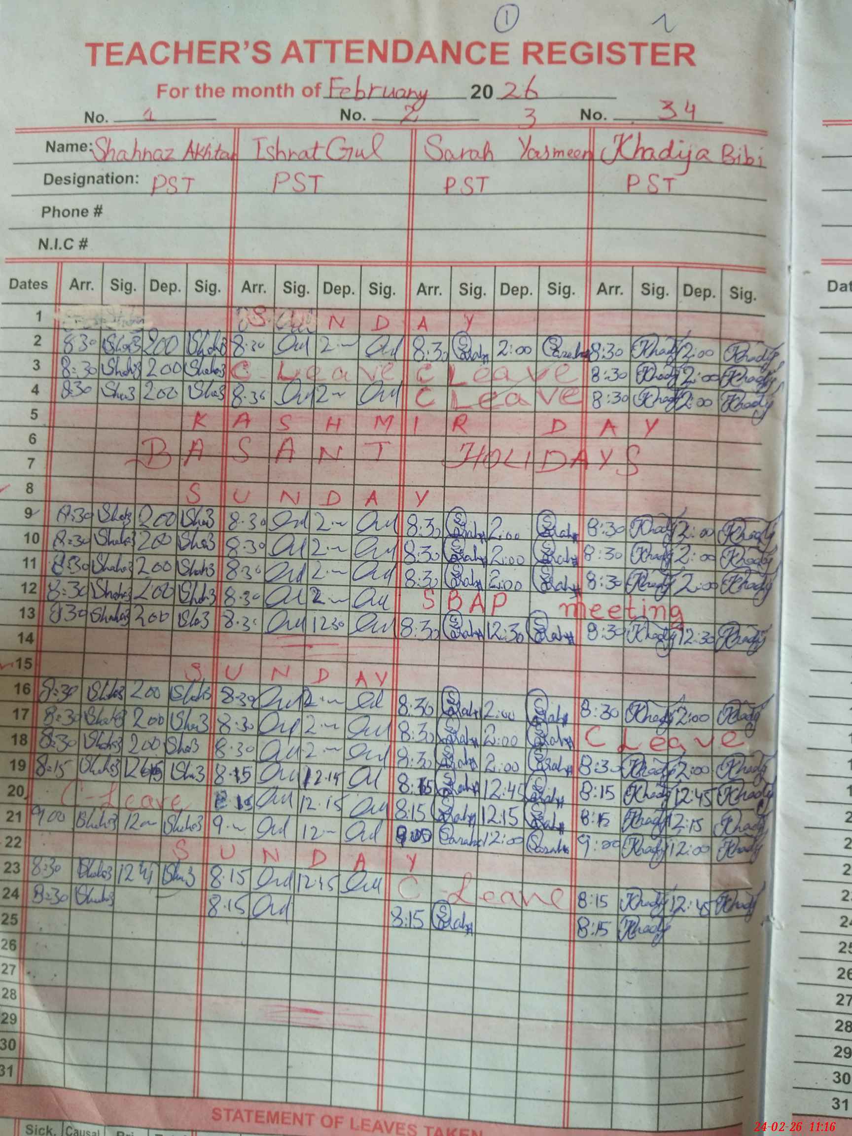 | CNIC | Full Name | Designation | R/C | Absence During Last Calender Month |