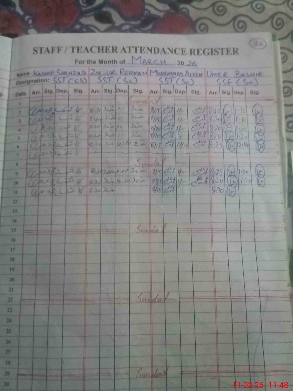 | CNIC | Full Name | Designation | R/C | Absence During Last Calender Month |