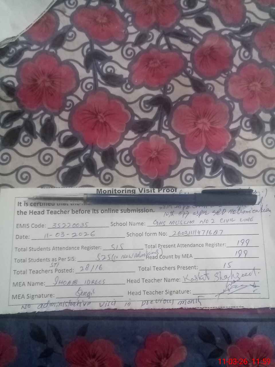 | Attendance Register | Head Teacher | MEA with School | Visit Proof |