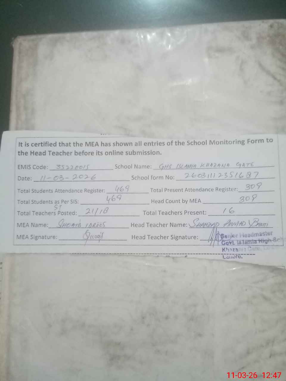 | EMIS Code: 35220015 | Name of School: GHS ISLAMIA KHAZANA GATE LOWER MALL | |||