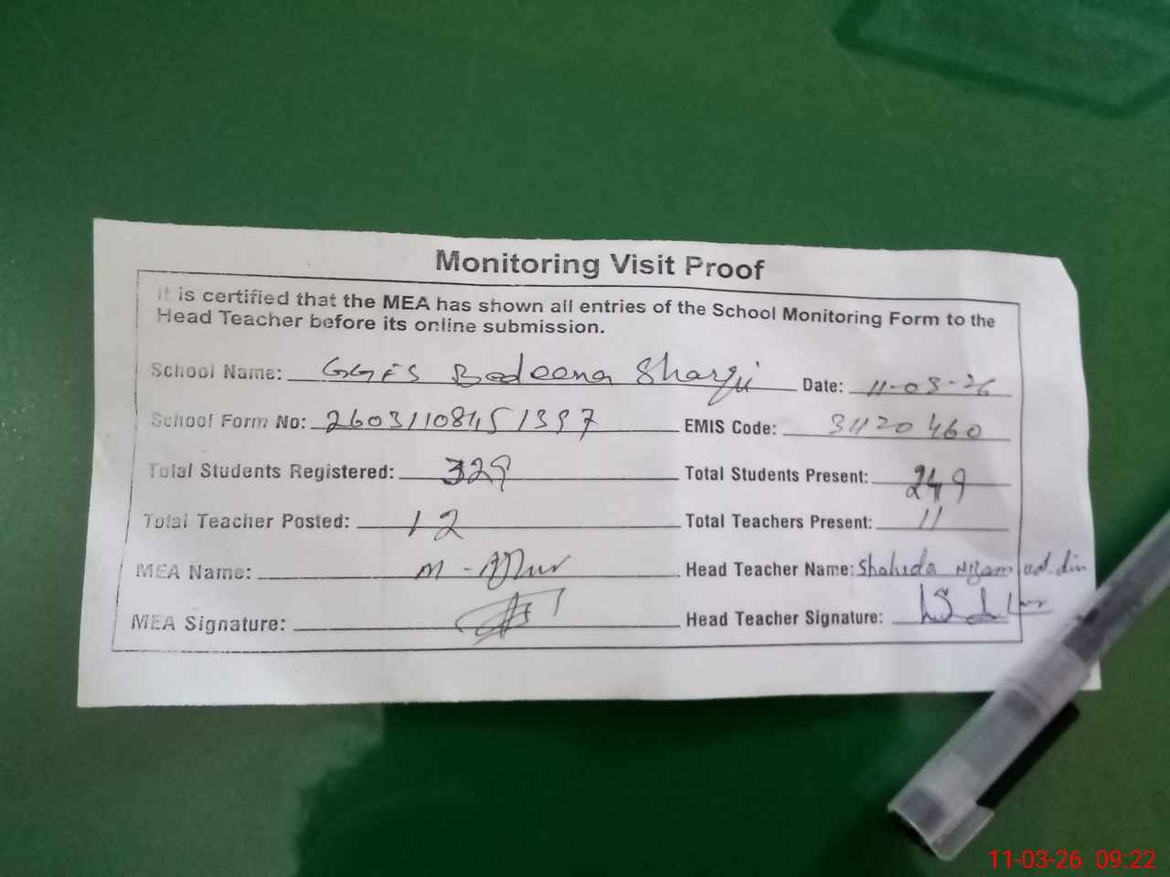 | Attendance Register | Head Teacher | MEA with School | Visit Proof |