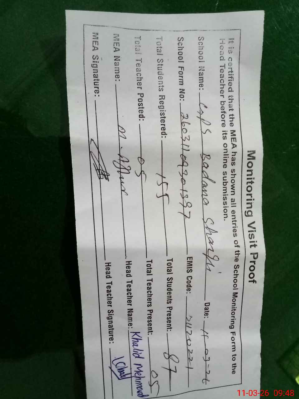 | Attendance Register | Head Teacher | MEA with School | Visit Proof |