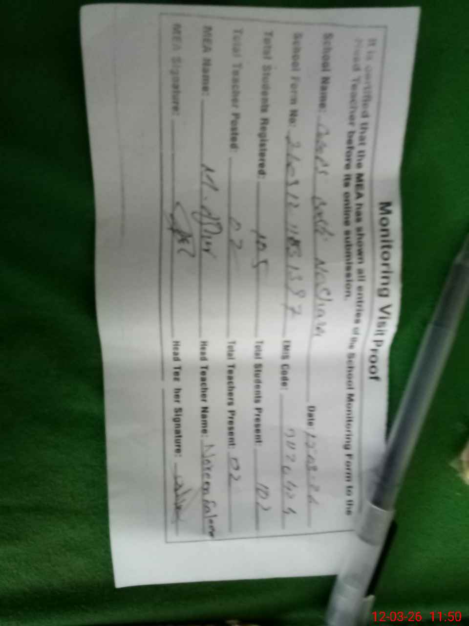 | Attendance Register | Head Teacher | MEA with School | Visit Proof |