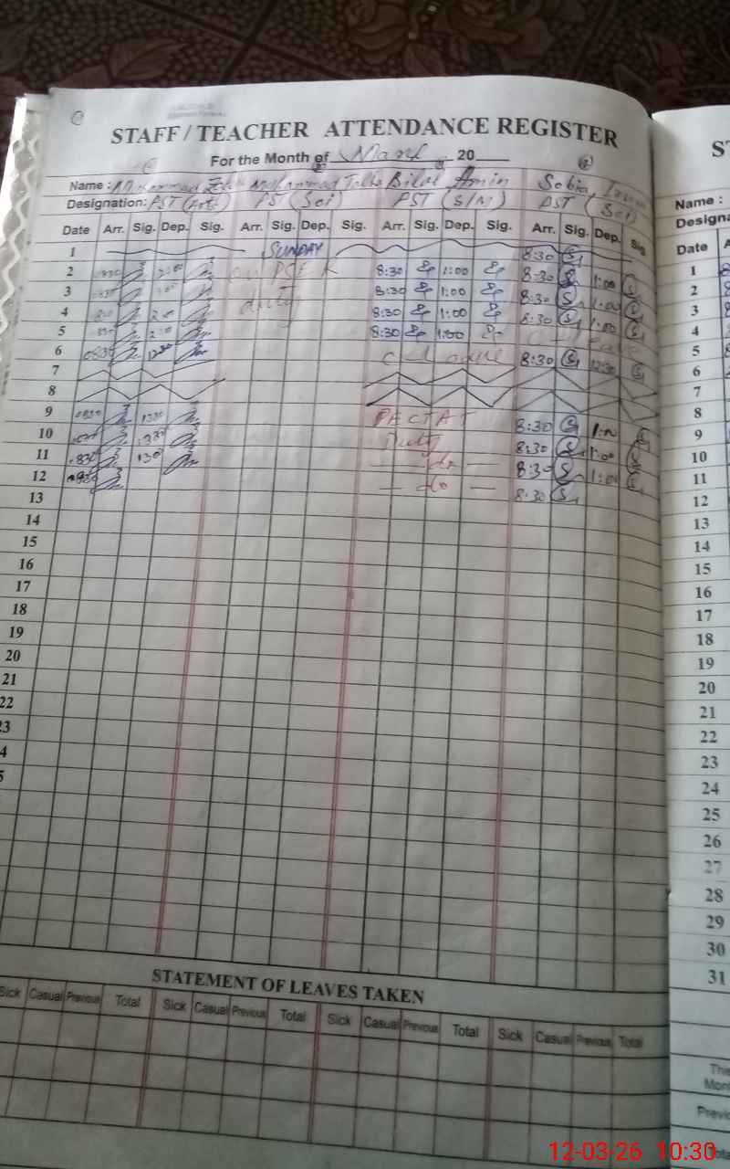 | 37**** | Bi**** Am**** | PST Science/Maths | Regular | 0 | 0 | 0 | 0 | 0 | 0 | 0 | 0 | 0 | Exam Duty |