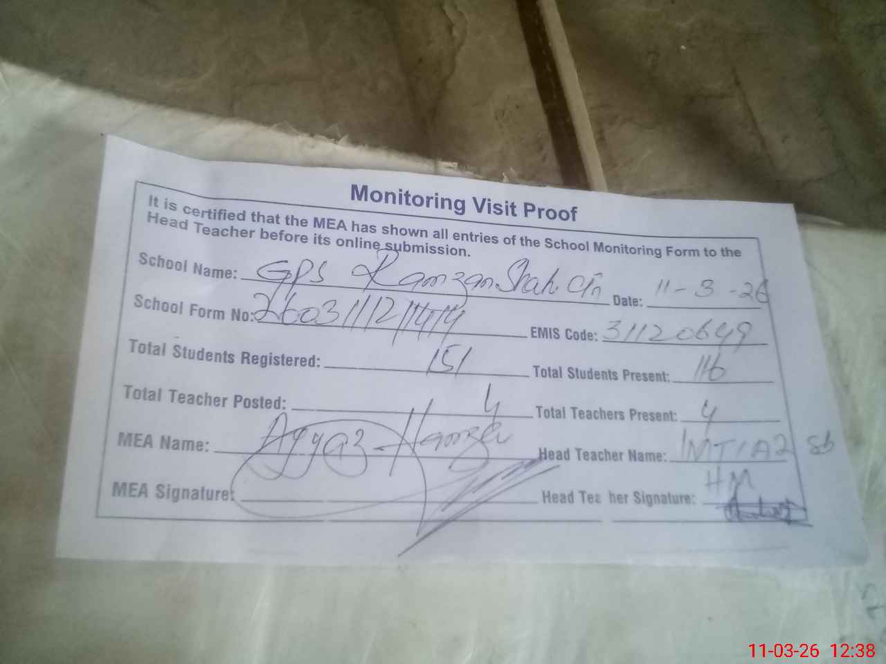 | Attendance Register | Head Teacher | MEA with School | Visit Proof |