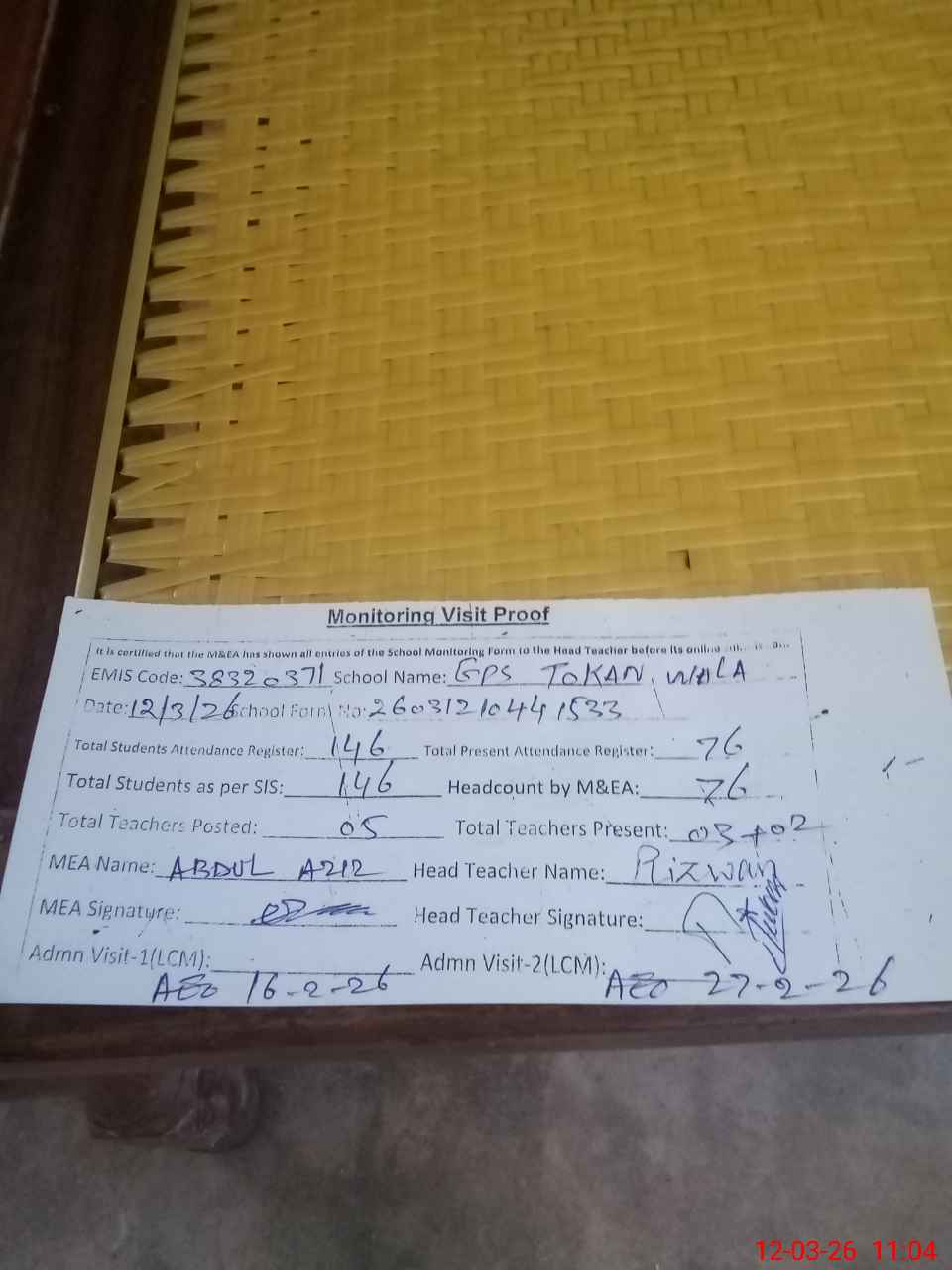 | Attendance Register | Head Teacher | MEA with School | Visit Proof |