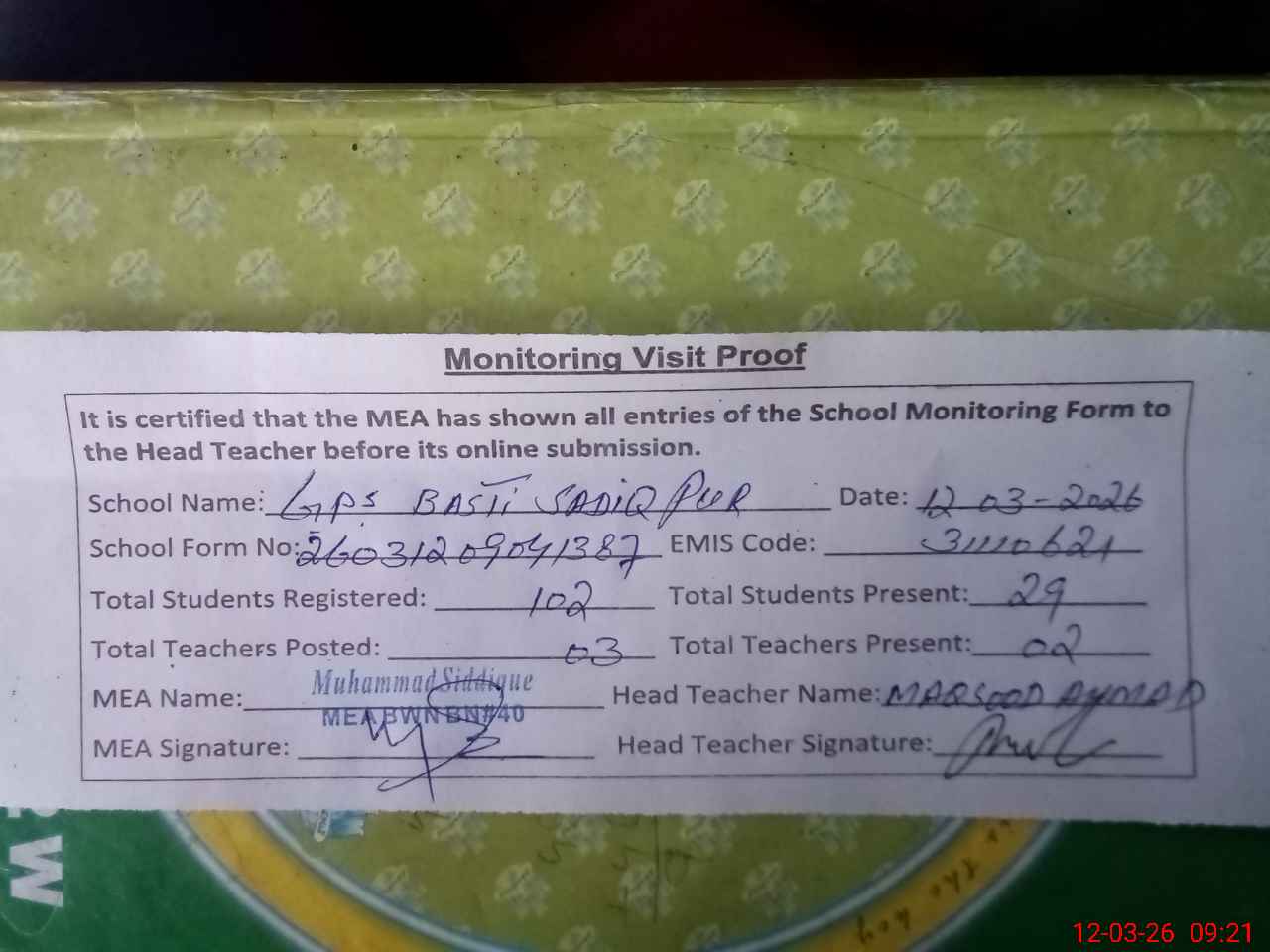 | EMIS Code: 31110621 | Name of School: GPS BASTI SADIQ PUR | |||