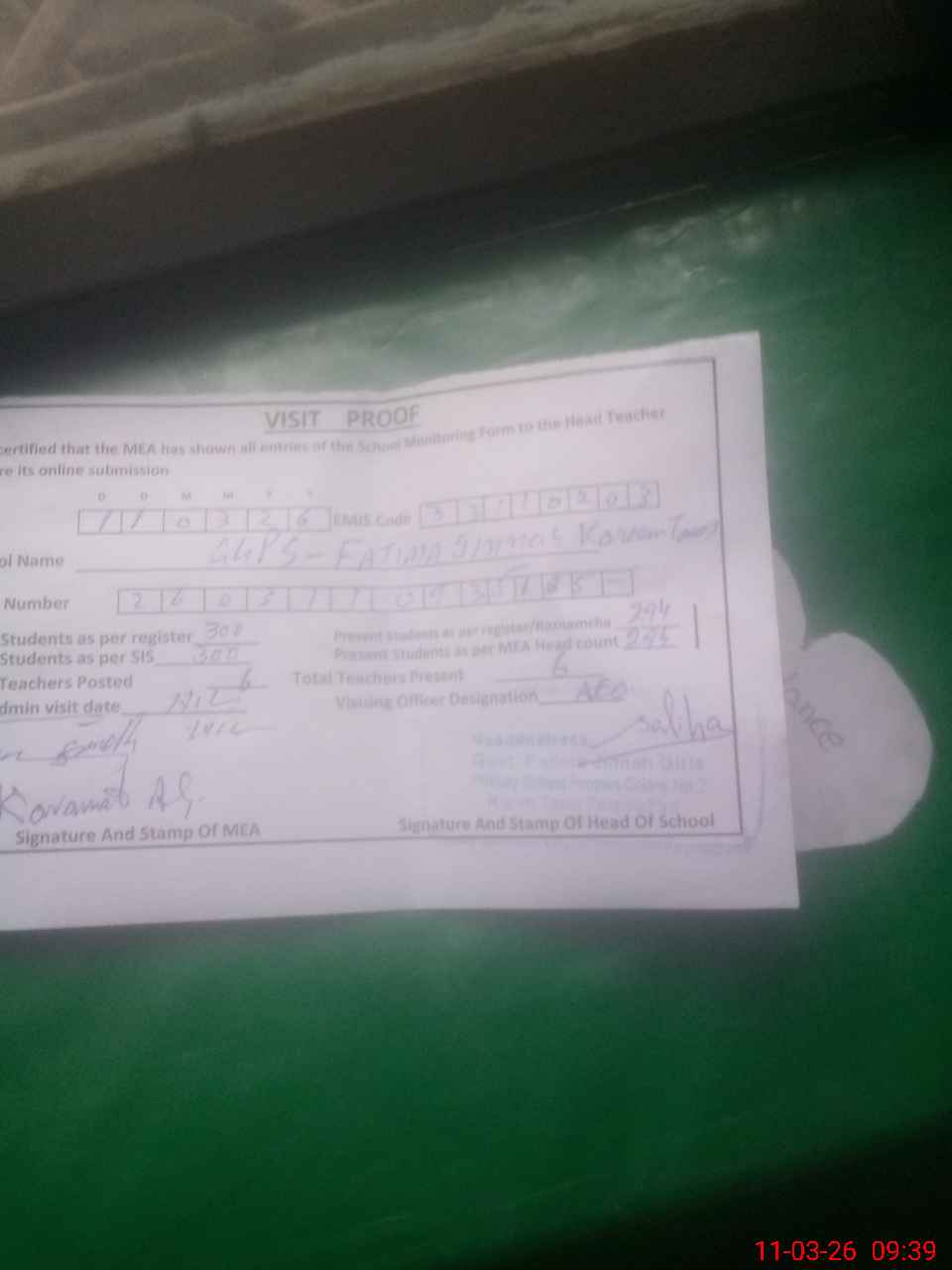 | Attendance Register | Head Teacher | MEA with School | Visit Proof |