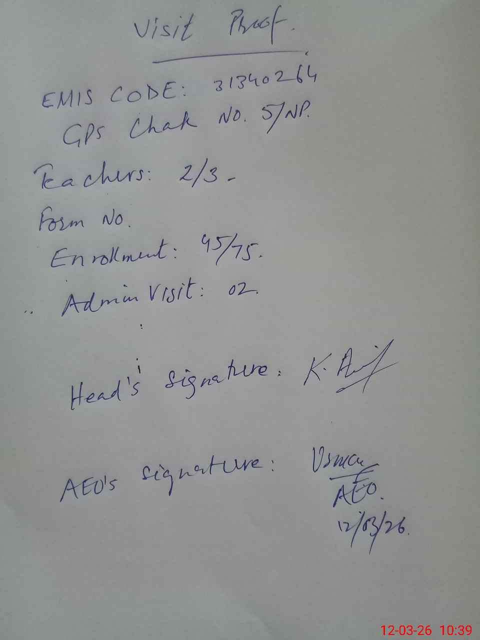 | Attendance Register | Head Teacher | MEA with School | Visit Proof |