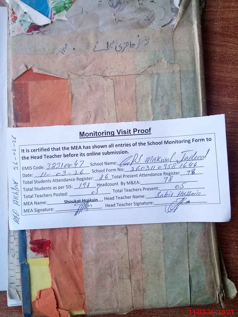 | Attendance Register | Head Teacher | MEA with School | Visit Proof |