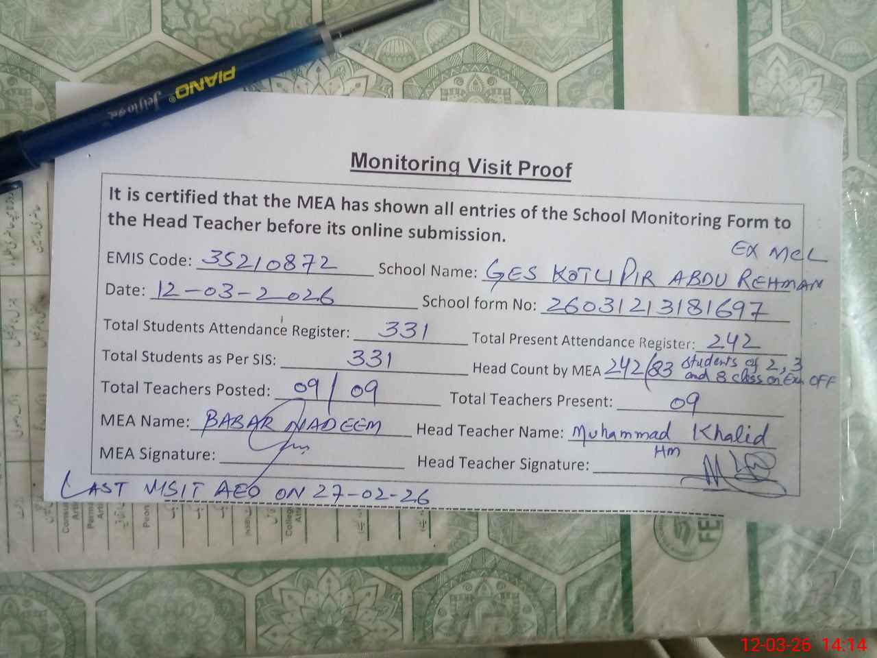 | Attendance Register | Head Teacher | MEA with School | Visit Proof |