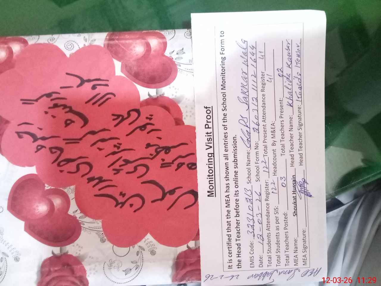 | Attendance Register | Head Teacher | MEA with School | Visit Proof |