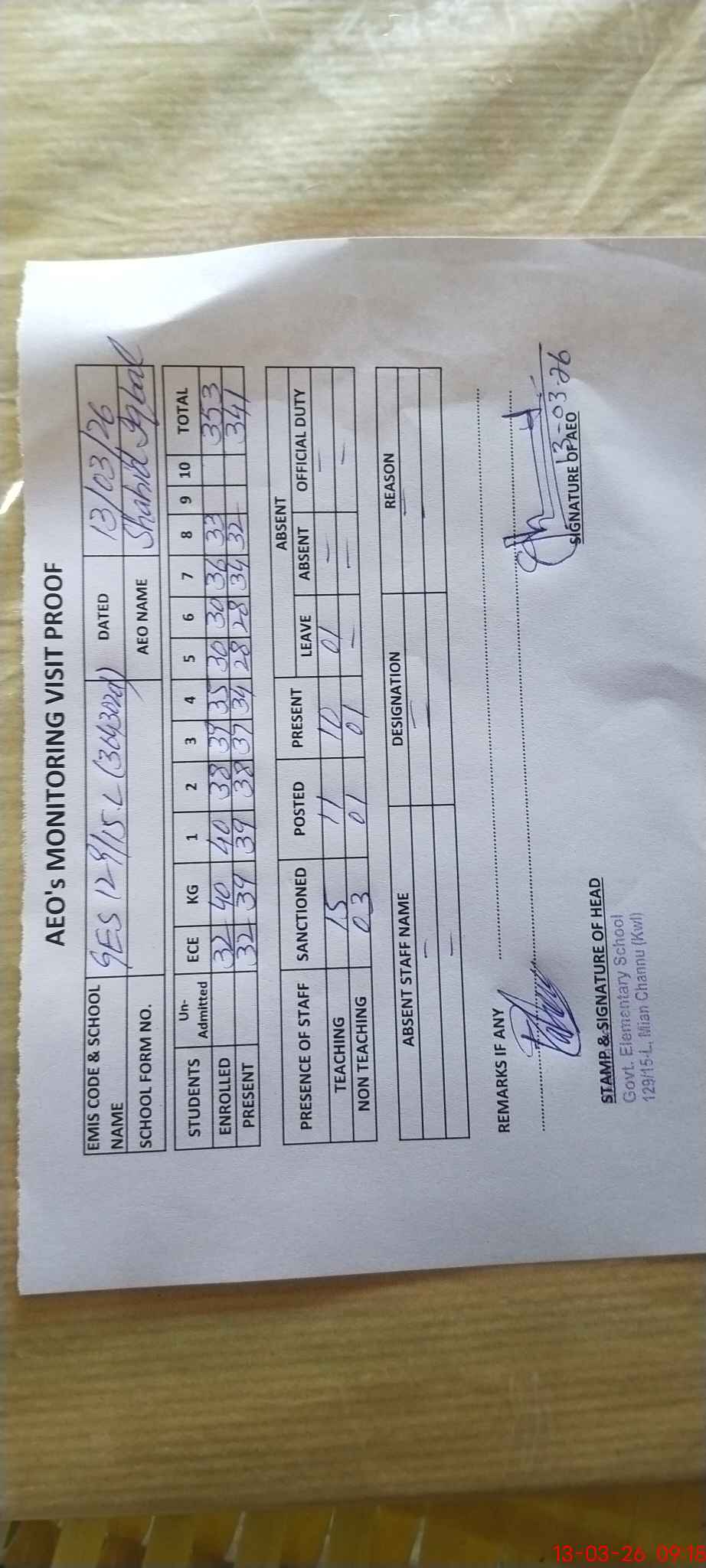 | Attendance Register | Head Teacher | MEA with School | Visit Proof |