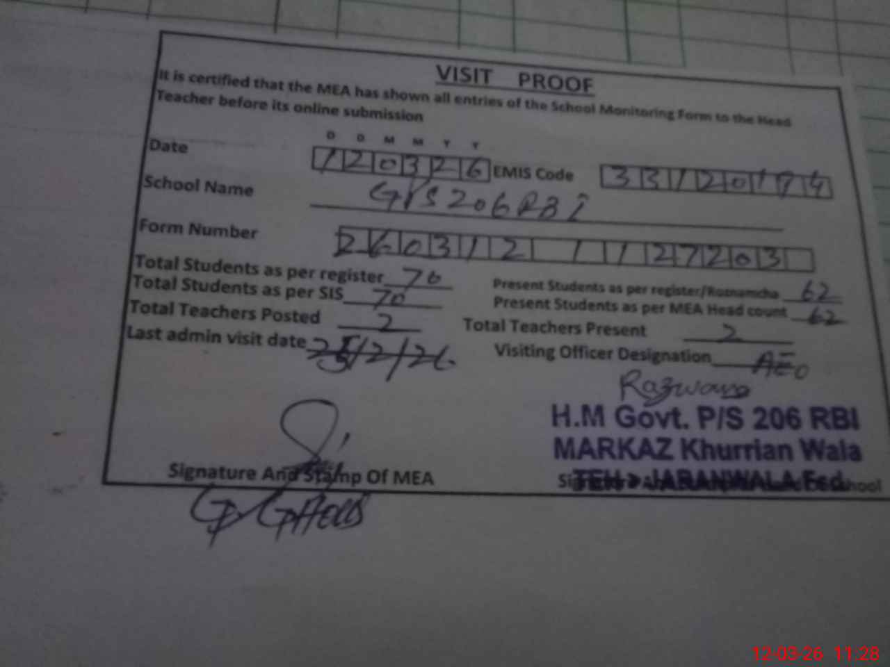 | Attendance Register | Head Teacher | MEA with School | Visit Proof |