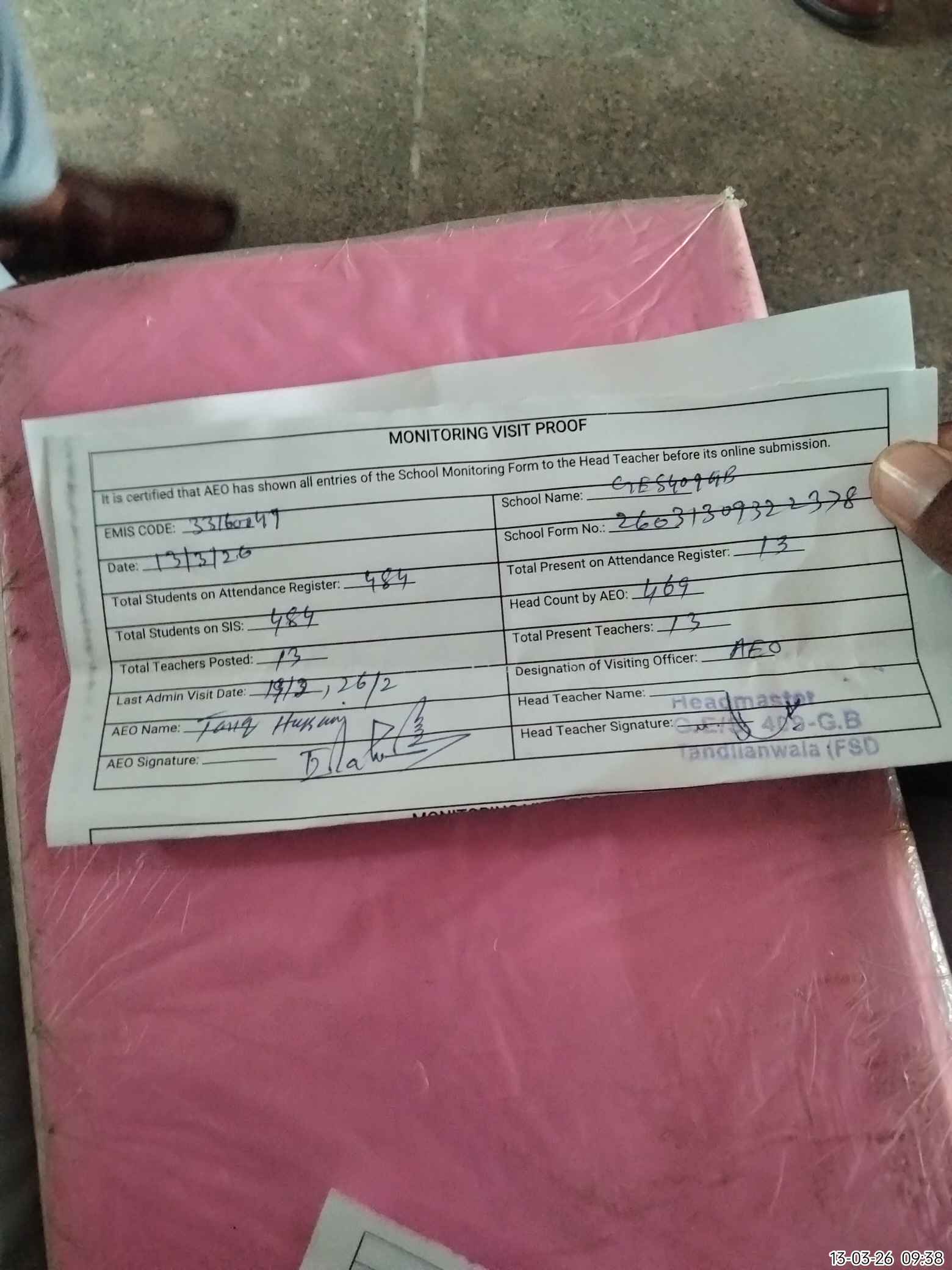 | EMIS Code: 33160047 | Name of School: GES CHAK 409 GB TANDLIANWALA FSD | |||