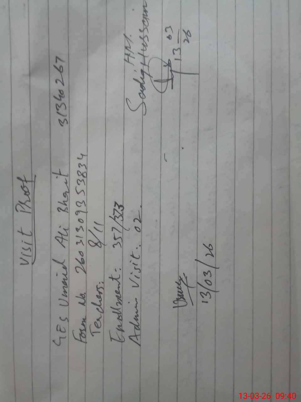 | Attendance Register | Head Teacher | MEA with School | Visit Proof |