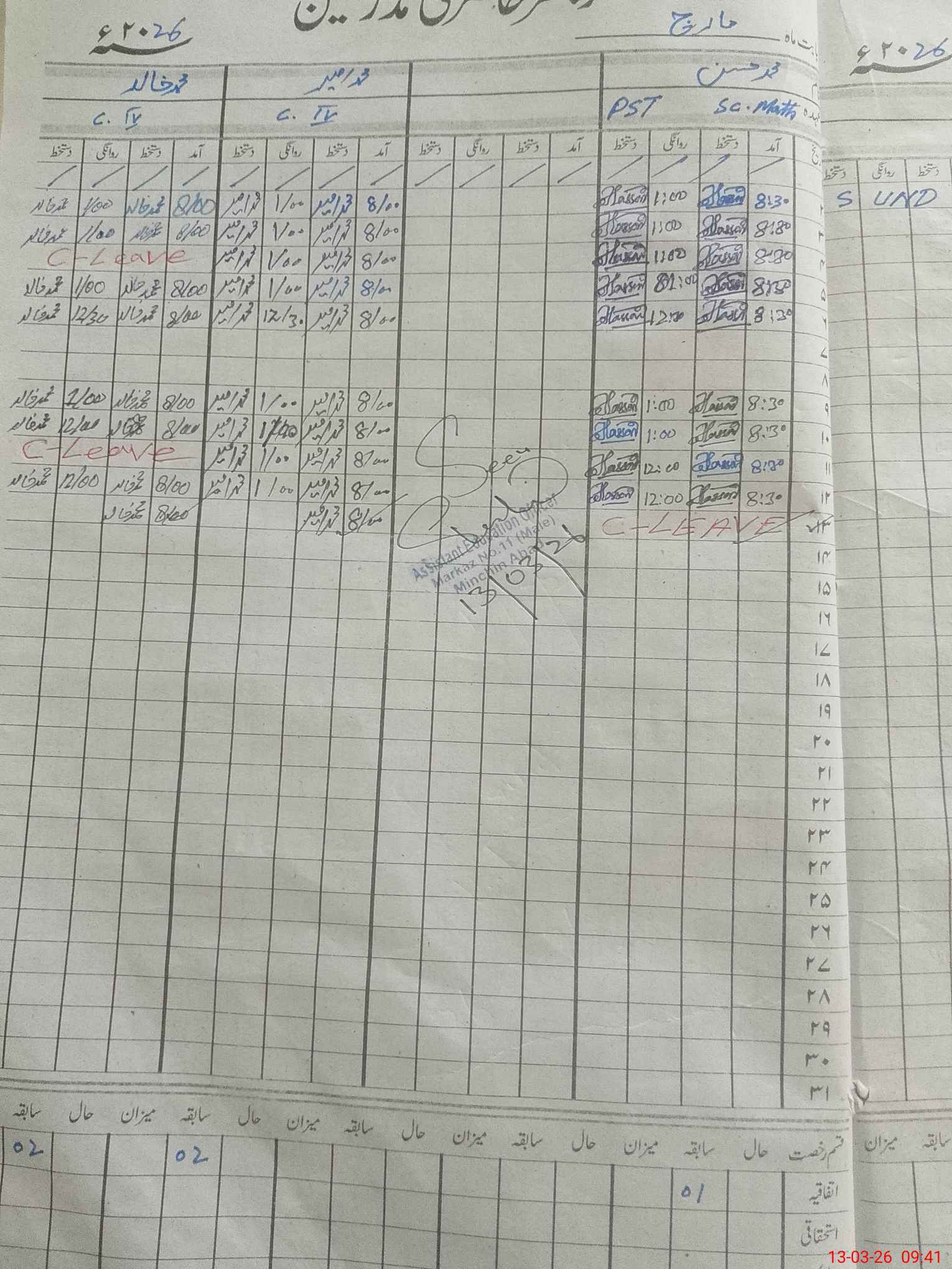 | CNIC | Full Name | Designation | R/C | Absence during last cal. month |