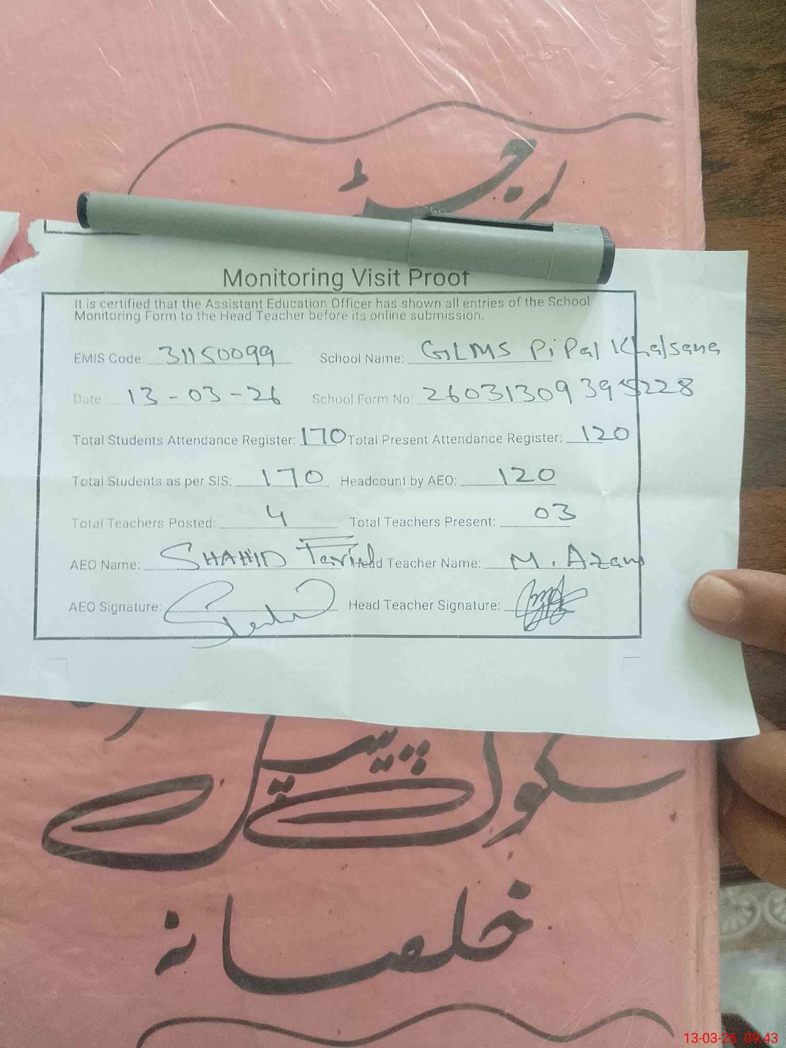 | Attendance Register | Head Teacher | MEA with School | Visit Proof |