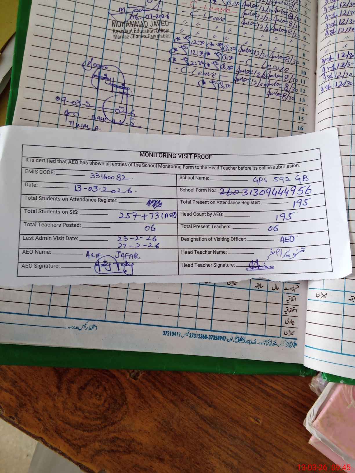 | Attendance Register | Head Teacher | MEA with School | Visit Proof |