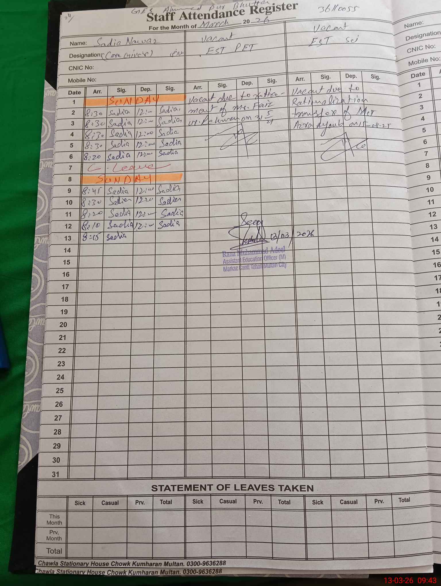 | Name: TA**** SH**** Designation: (School Headmaster's/Headmistress's) Sst Sc Phone/Cell Number: 03**** |