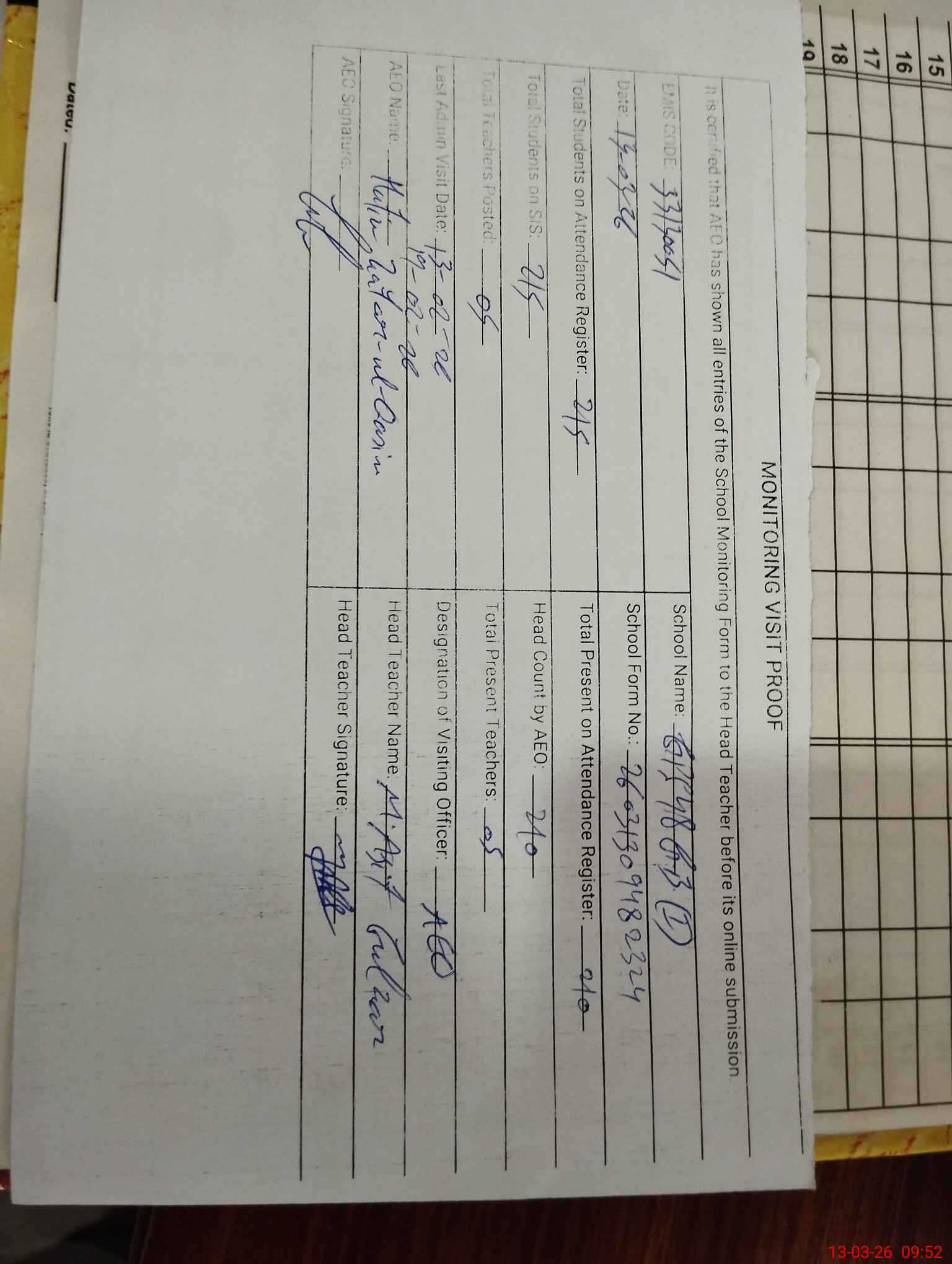 | Certified that this School was Inspected by the Undersigned MEA/DMO Today and the Information Stated Above is as Per Record. | |||||
