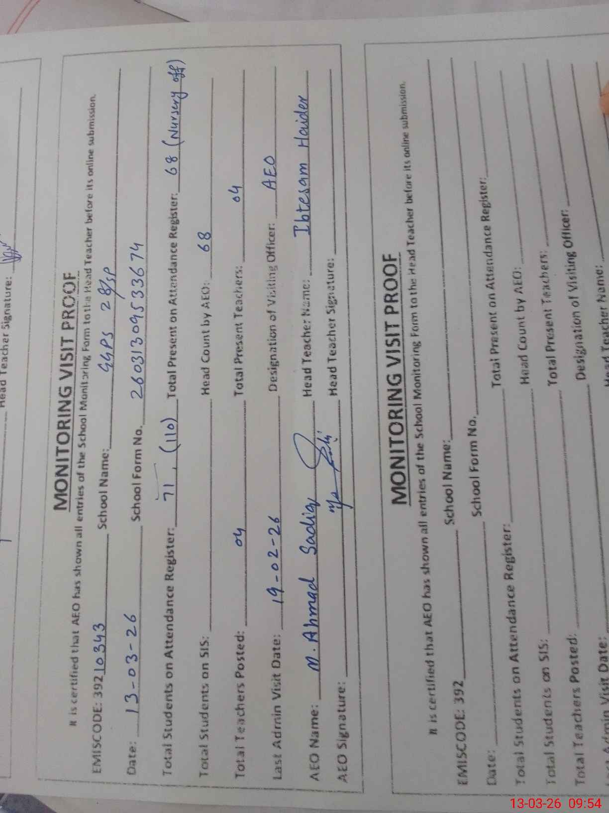 | Attendance Register | Head Teacher | MEA with School | Visit Proof |