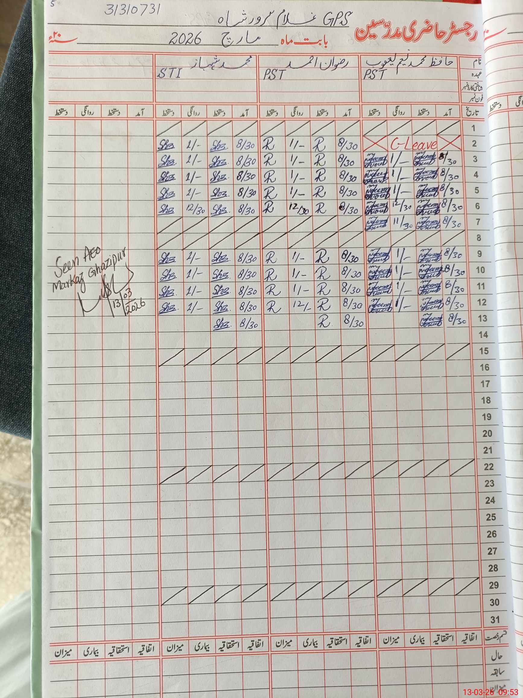 | CNIC | Full Name | Designation | R/C | Absence During Last Calender Month |