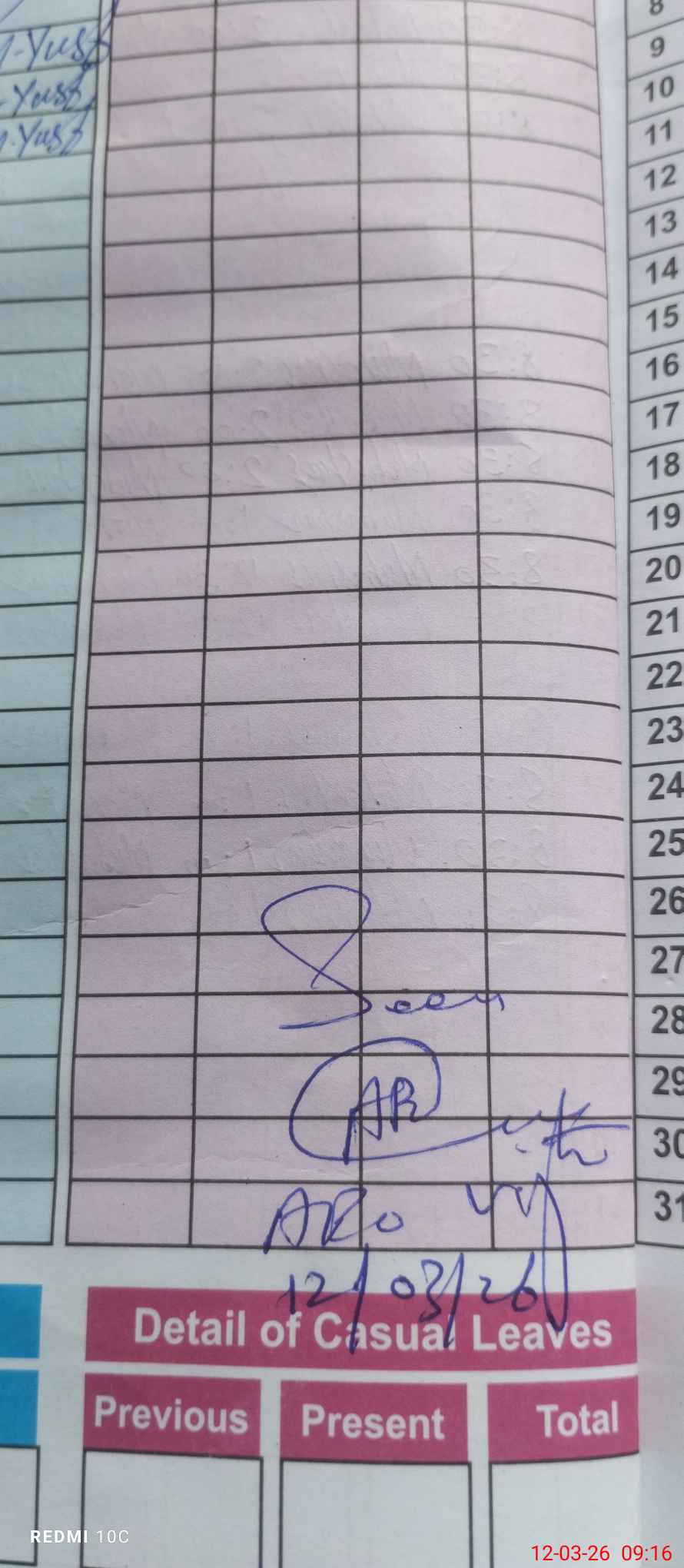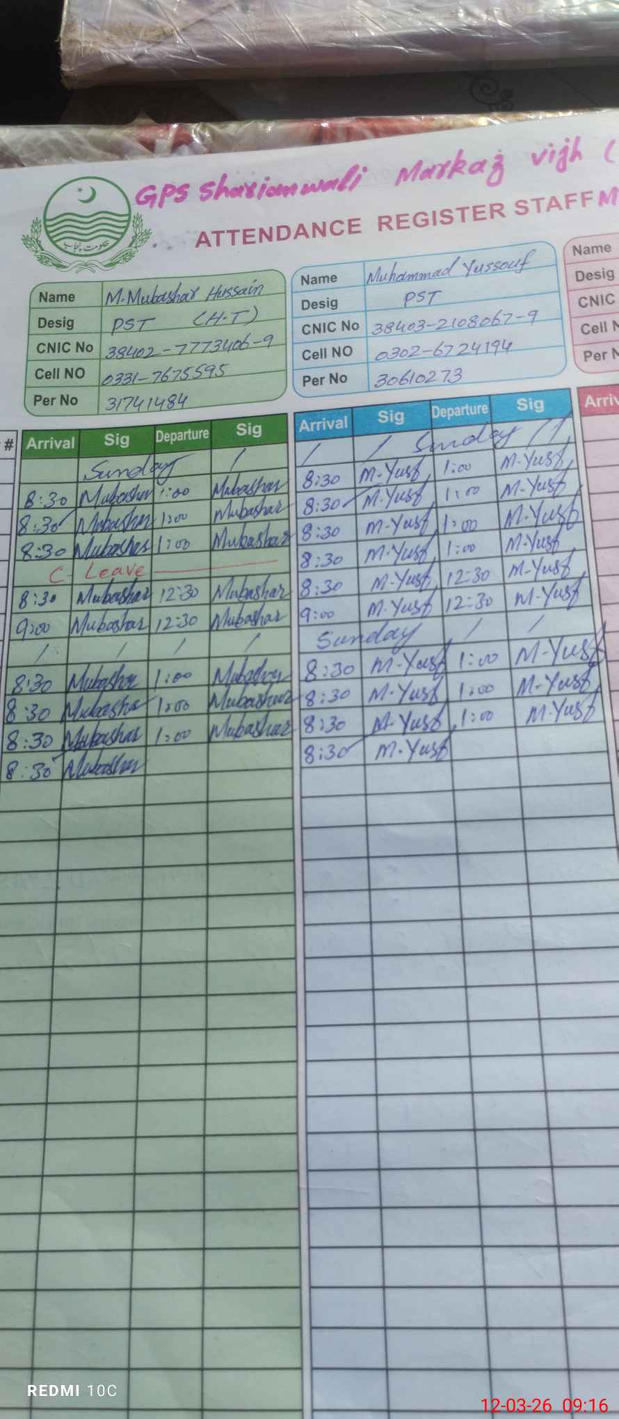 | CNIC | Full Name | Designation | R/C | Absence During Last Calender Month |