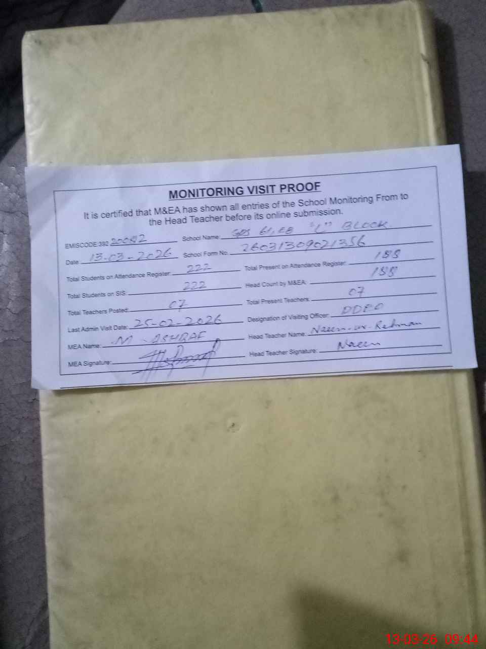 | Attendance Register | Head Teacher | MEA with School | Visit Proof |
