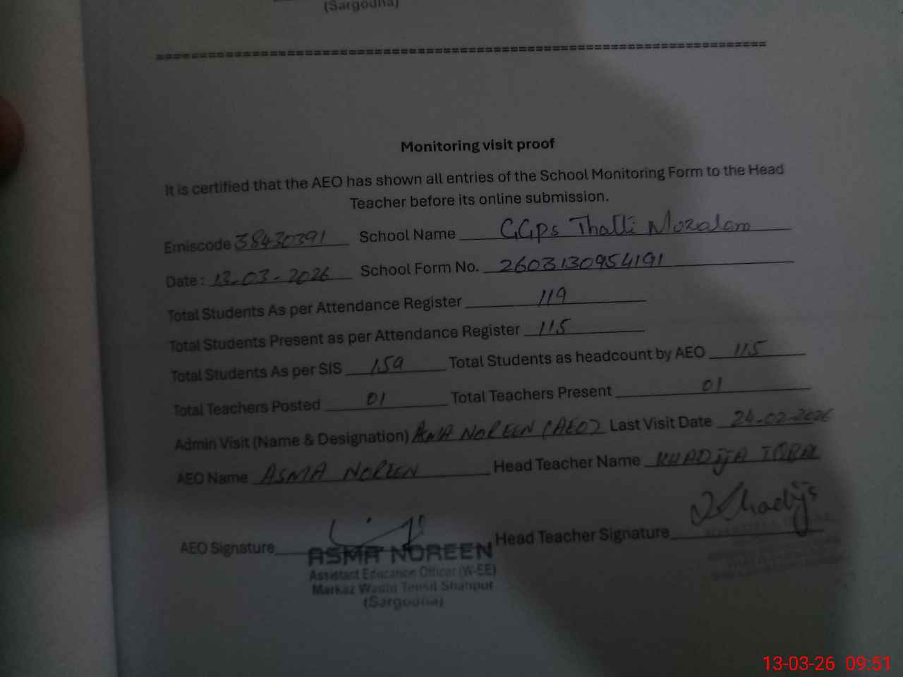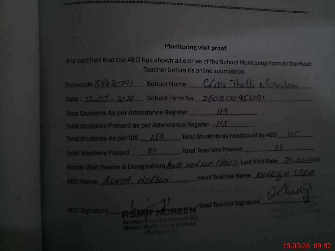 | Attendance Register | Head Teacher | MEA with School | Visit Proof |