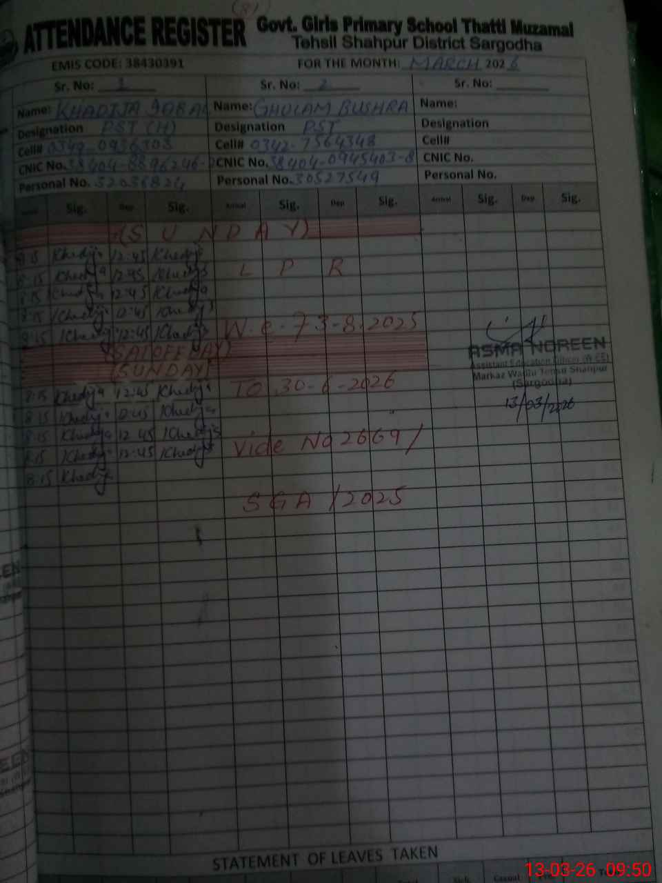 | Name: KH**** IQ**** Designation: (School Headmaster's/Headmistress's) PST Phone/Cell Number: 03**** |