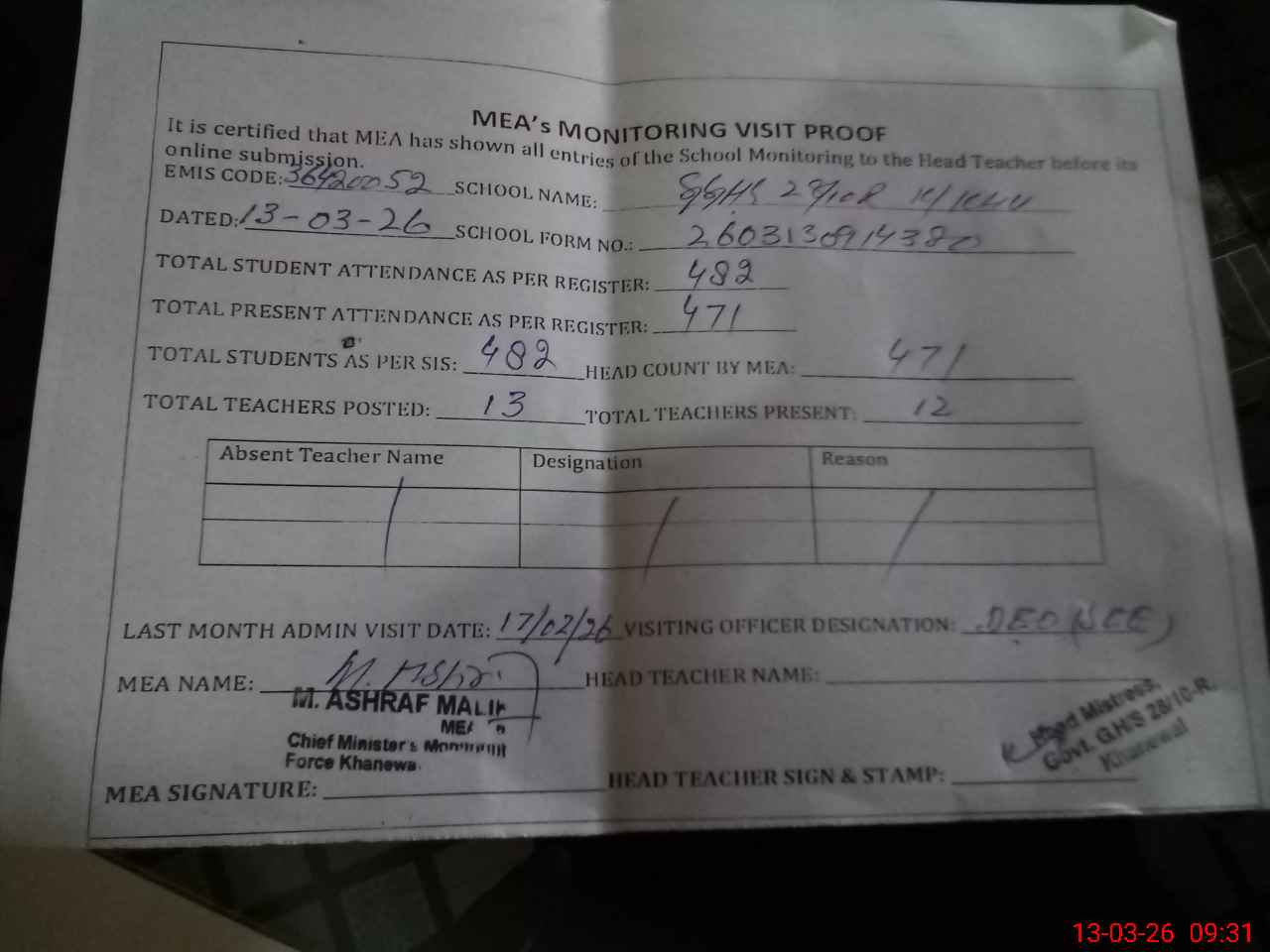 | Attendance Register | Head Teacher | MEA with School | Visit Proof |
