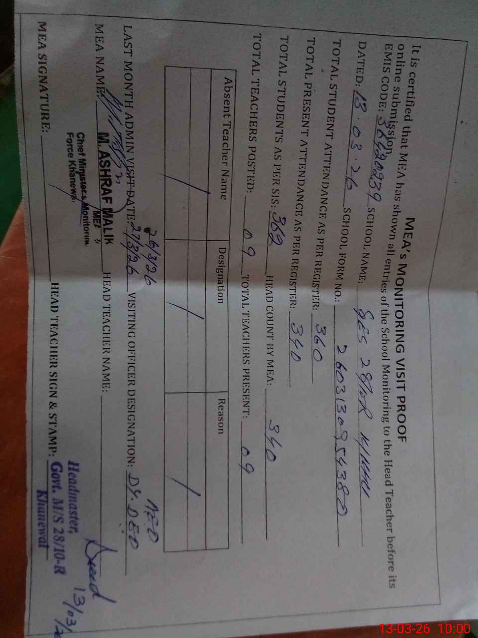 | Certified that this School was Inspected by the Undersigned MEA/DMO Today and the Information Stated Above is as Per Record. | |||||