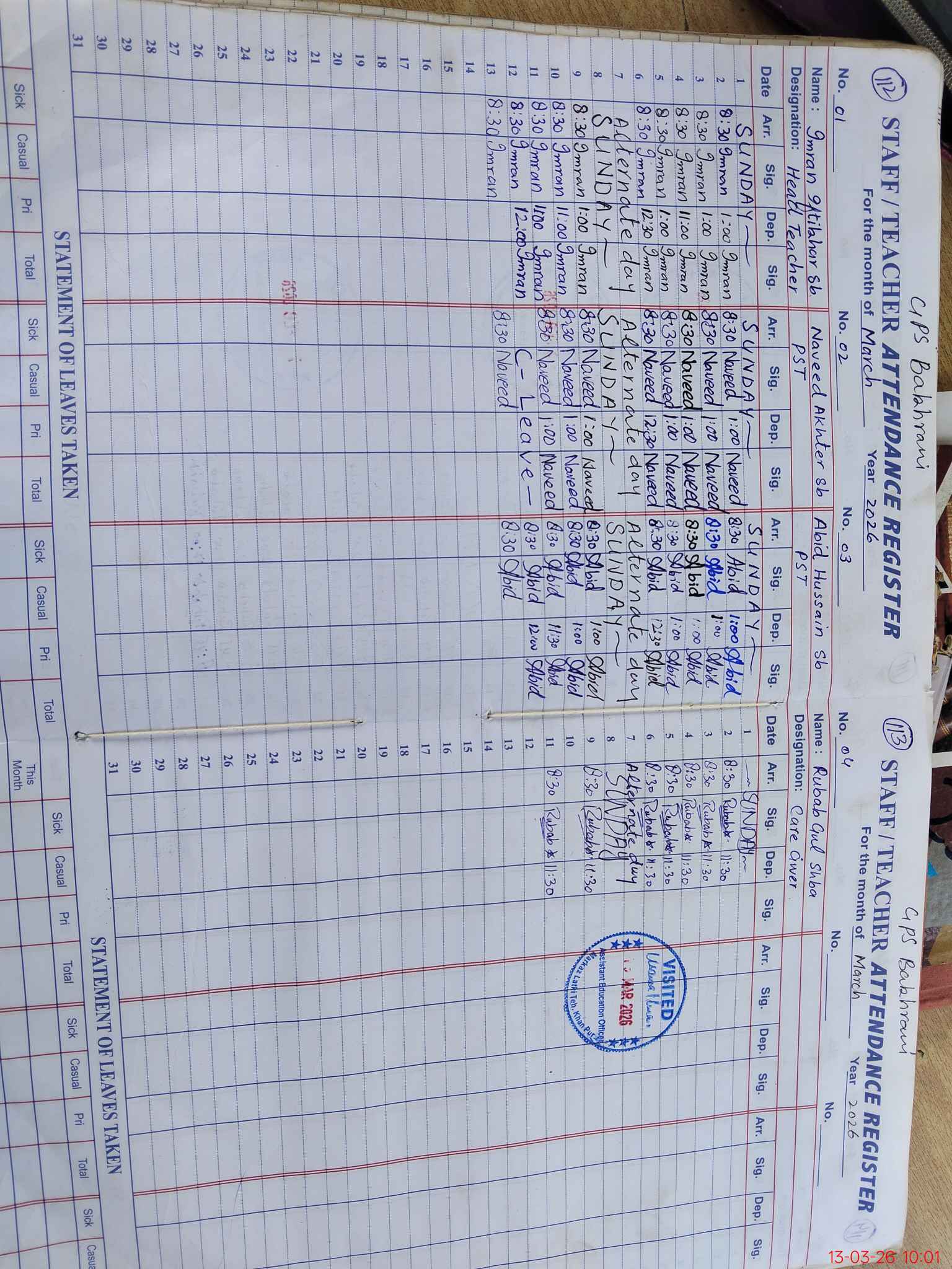 | CNIC | Full Name | Designation | R/C | Absence During Last Calender Month |