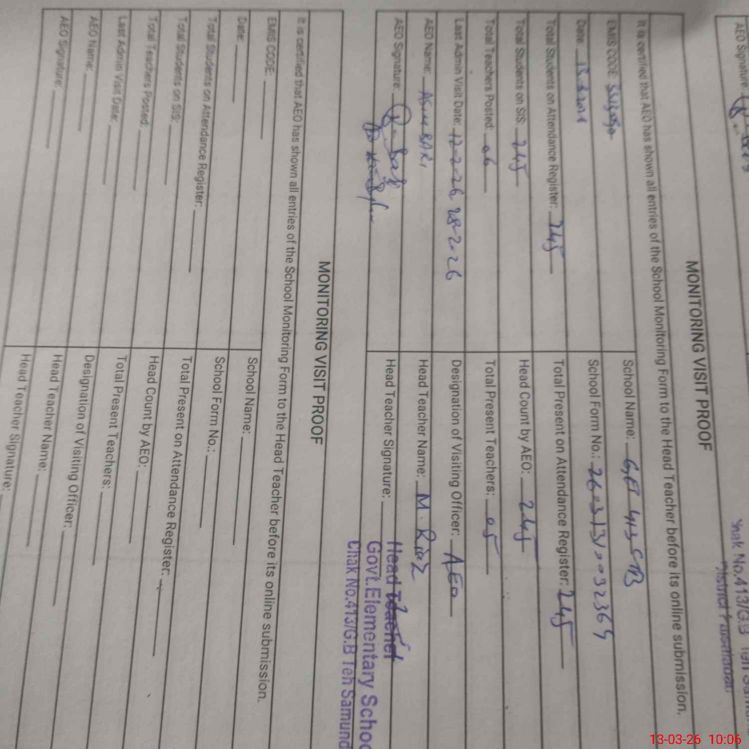 | Certified that this School was Inspected by the Undersigned MEA/DMO Today and the Information Stated Above is as Per Record. | |||||