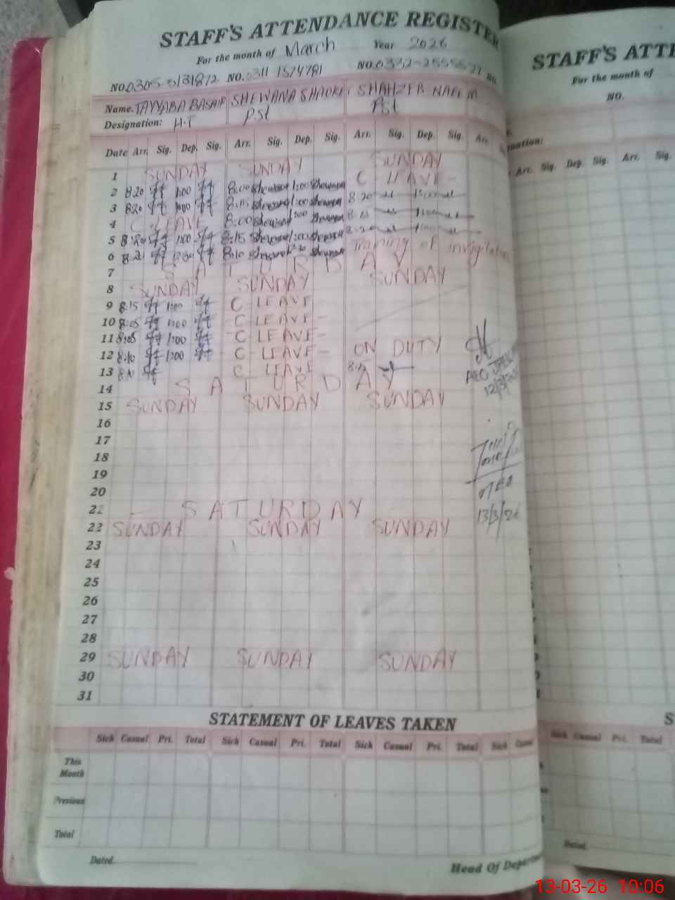 | Leave | Duty | Absent | Maternity | Medical | Ex- Pak |