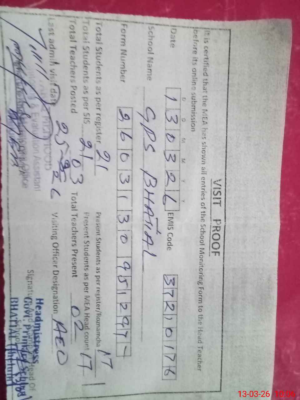 | Attendance Register | Head Teacher | MEA with School | Visit Proof |