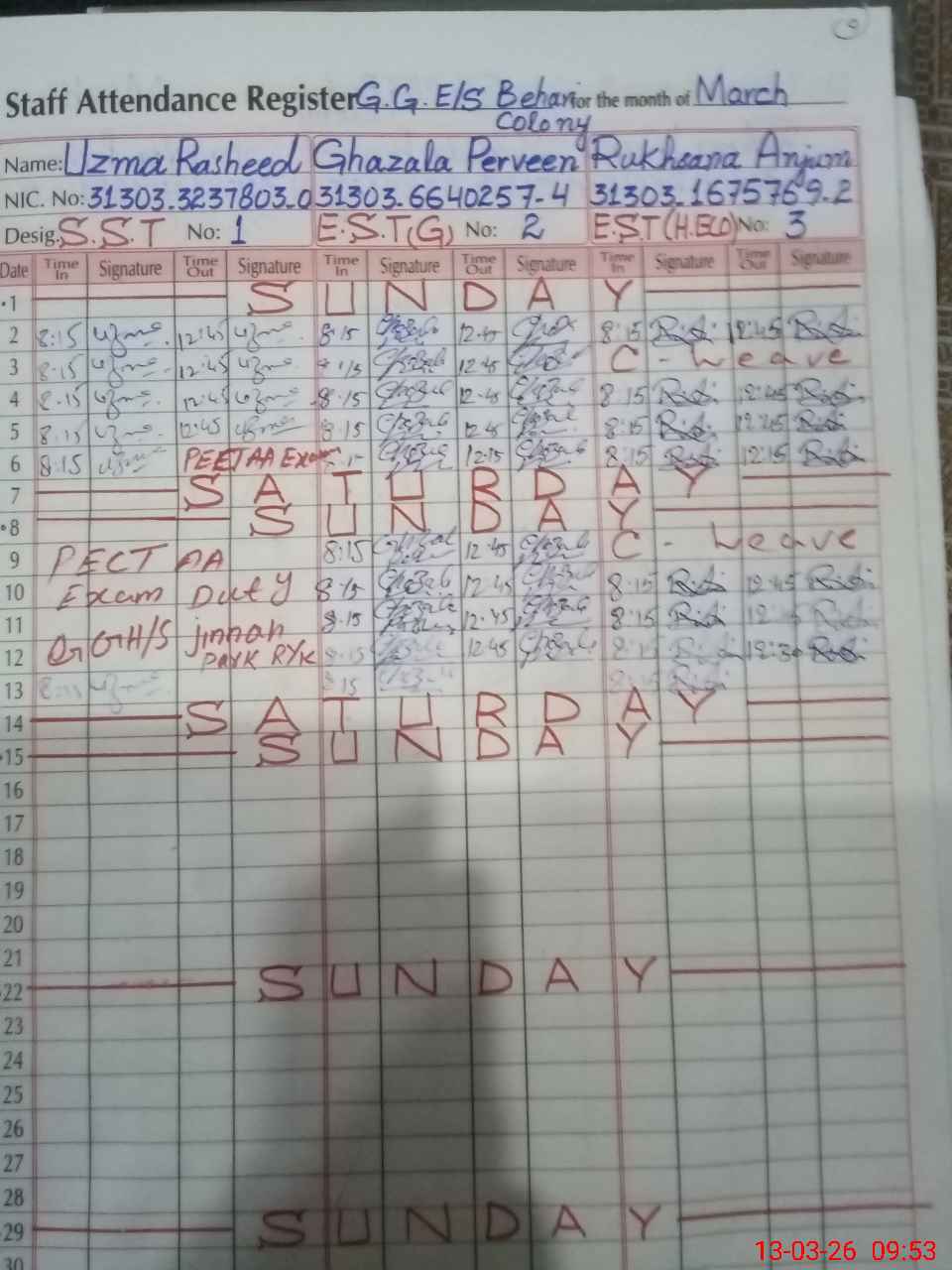 | CNIC | Full Name | Designation | R/C | Absence During Last Calender Month |