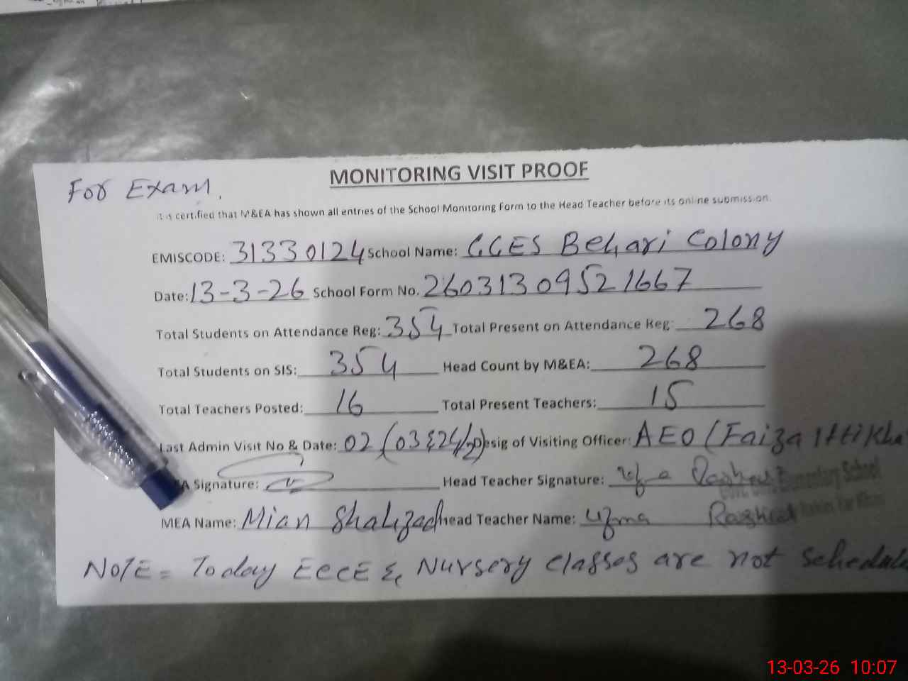 | Remarks (Use Separate Page if Required): Today ECCE and Nursery classes are not scheduled for exam | |||||
