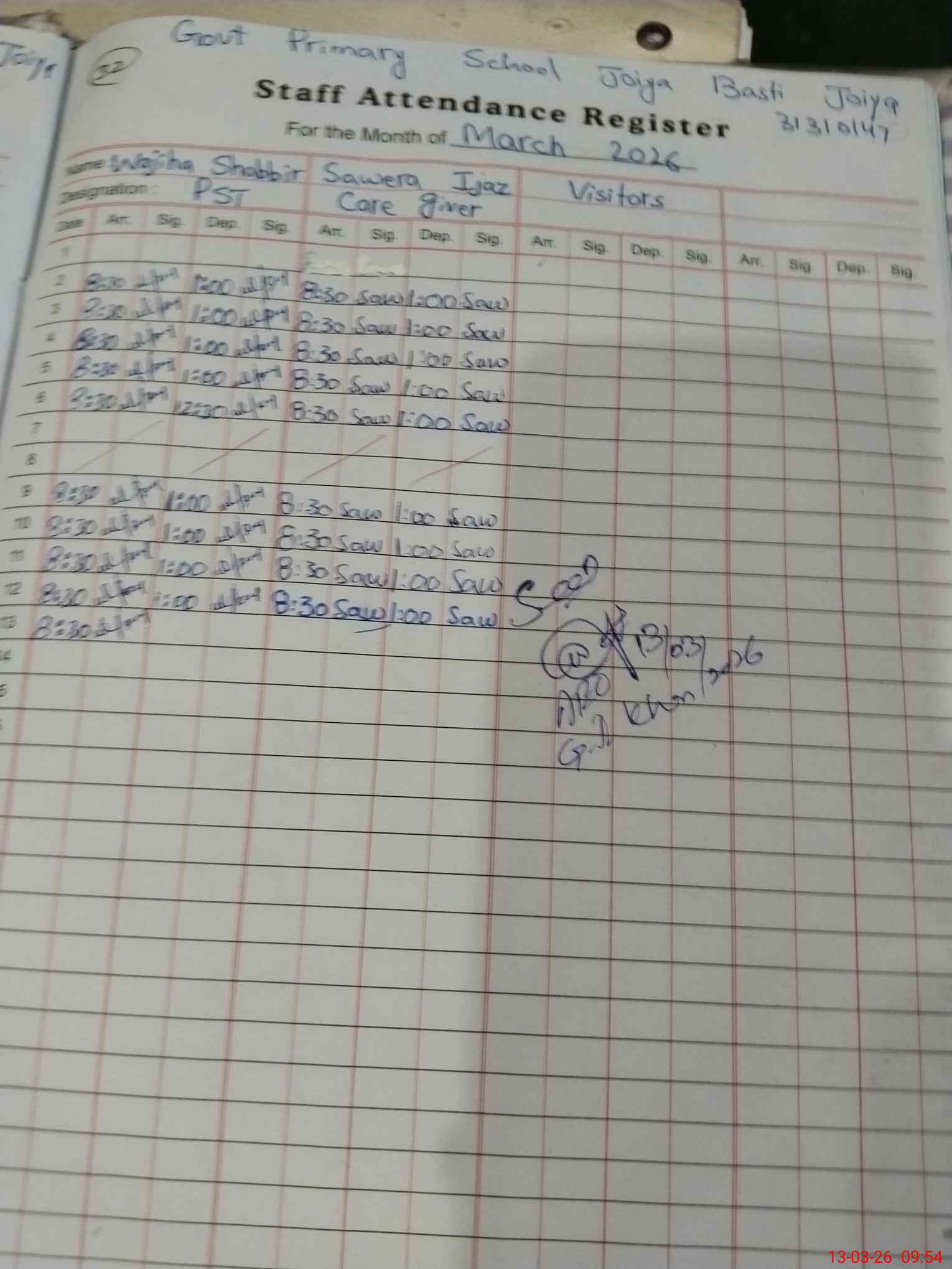 | Name: Mu**** As**** Designation: (School Headmaster's/Headmistress's) PST Phone/Cell Number: 03**** |