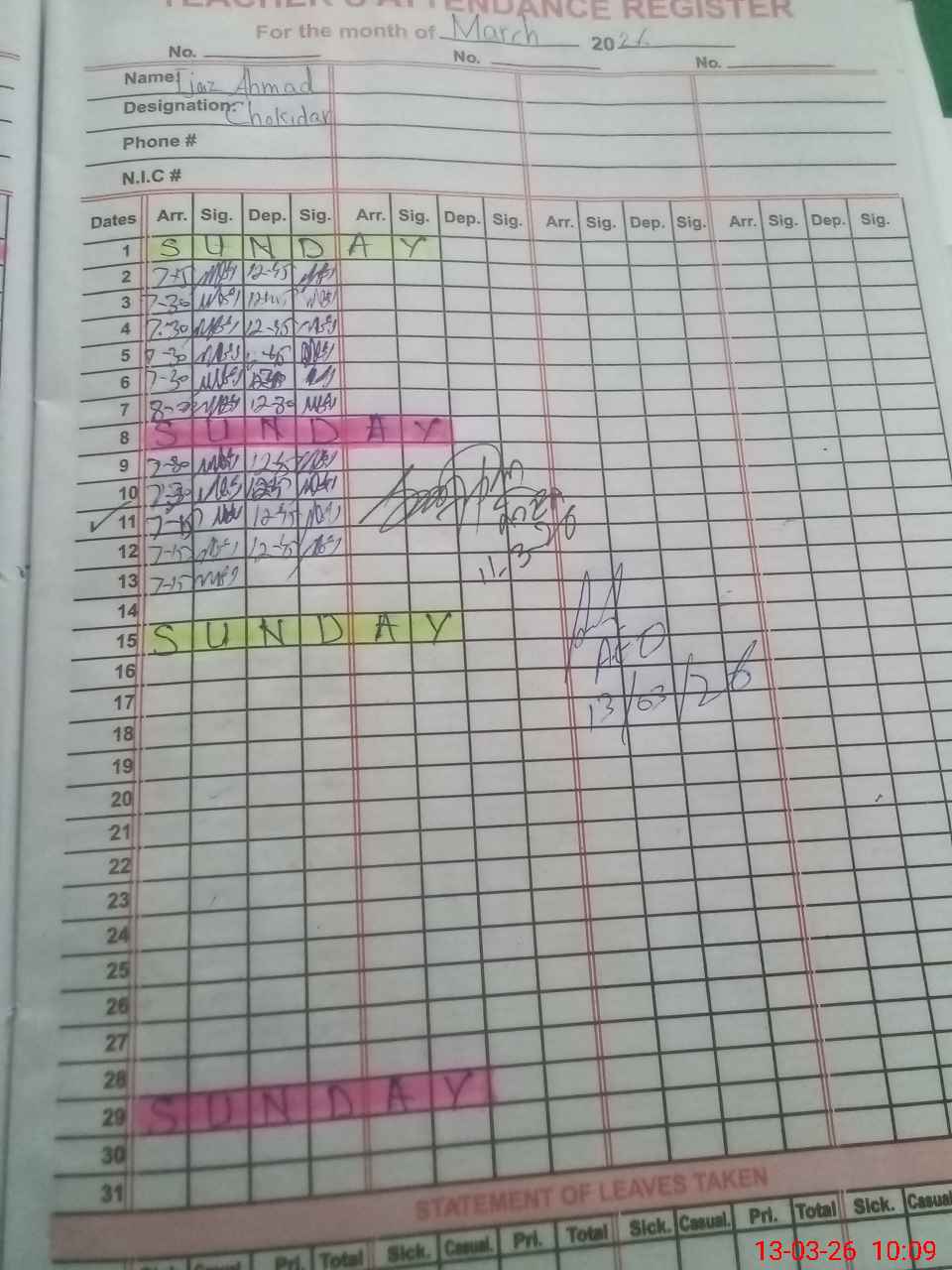 | CNIC | Full Name | Designation | R/C | Absence During Last Calender Month |